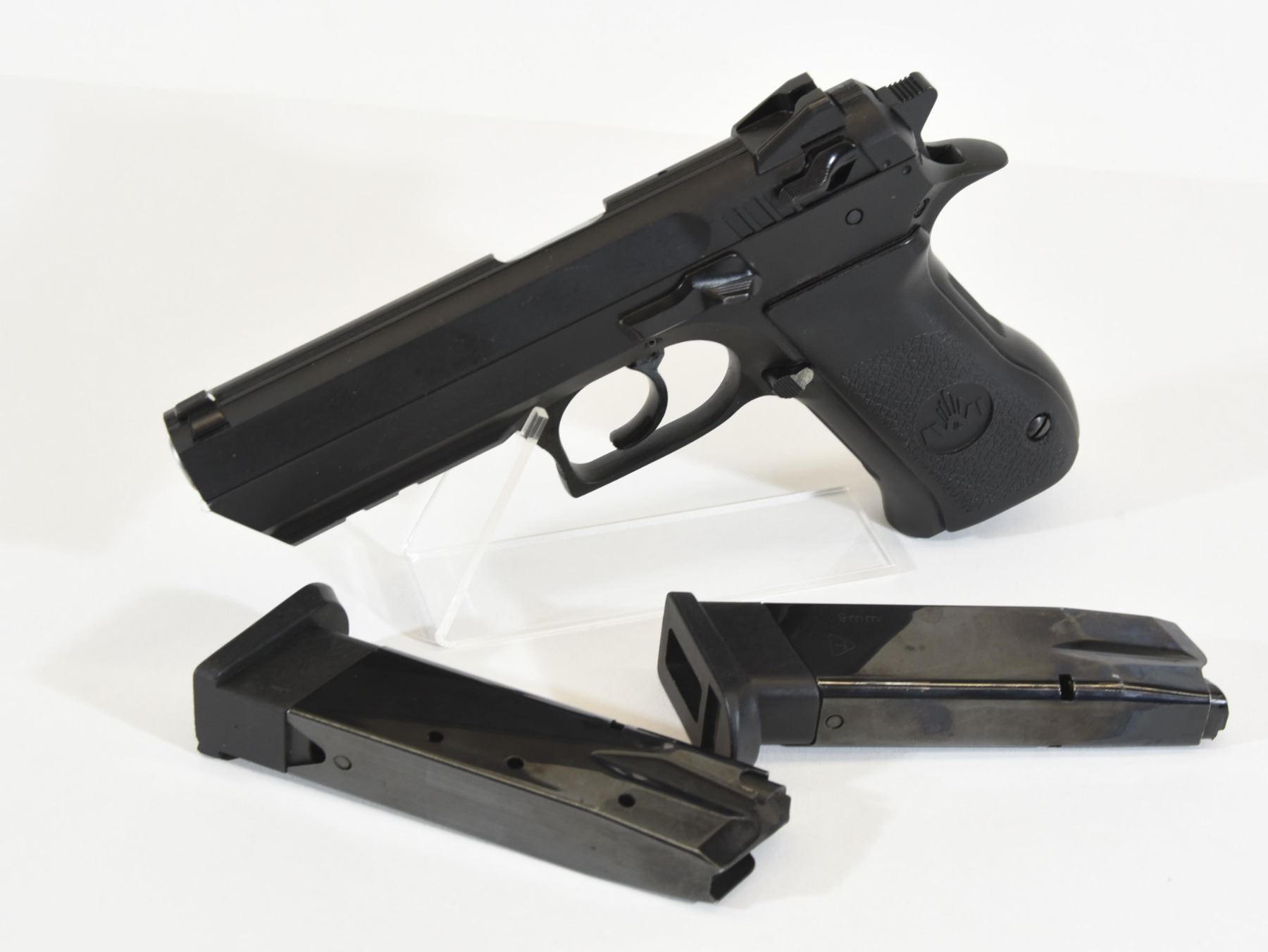 Restricted, semi-auto, 9mm Luger, 112mm barrel, SN 39327181. Metal has a few handling marks otherwise very good condition. Extra mag.