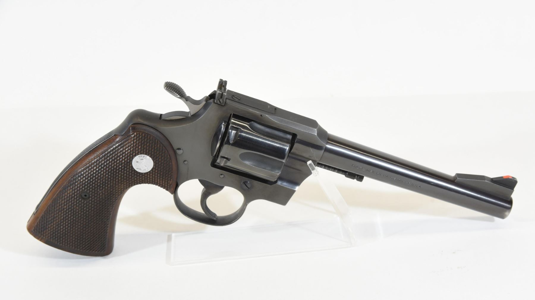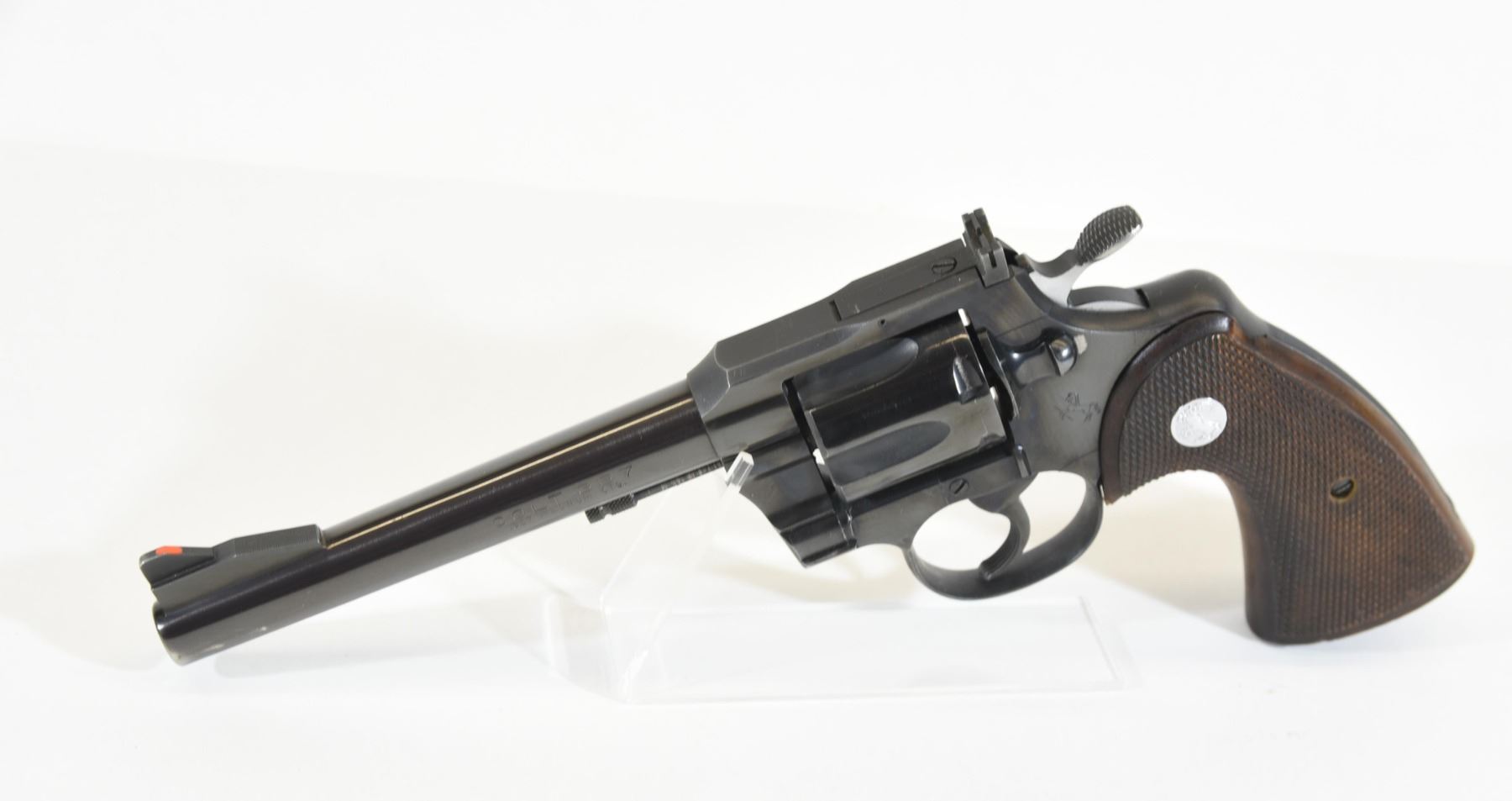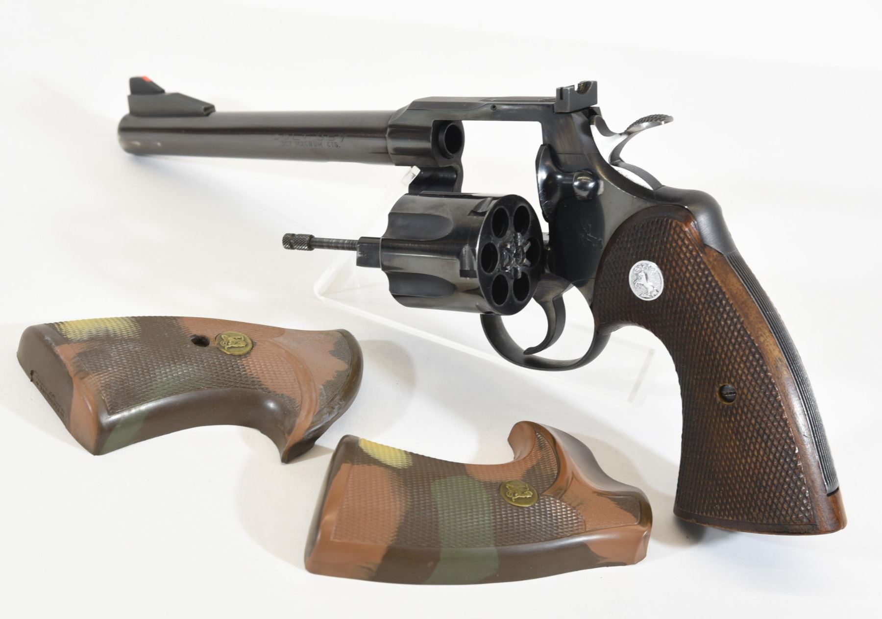Restricted, revolver, 357 magnum, 152mm barrel, SN 7773. Wood grips have a small chip, bluing has some marks and scratches, bore excellent.