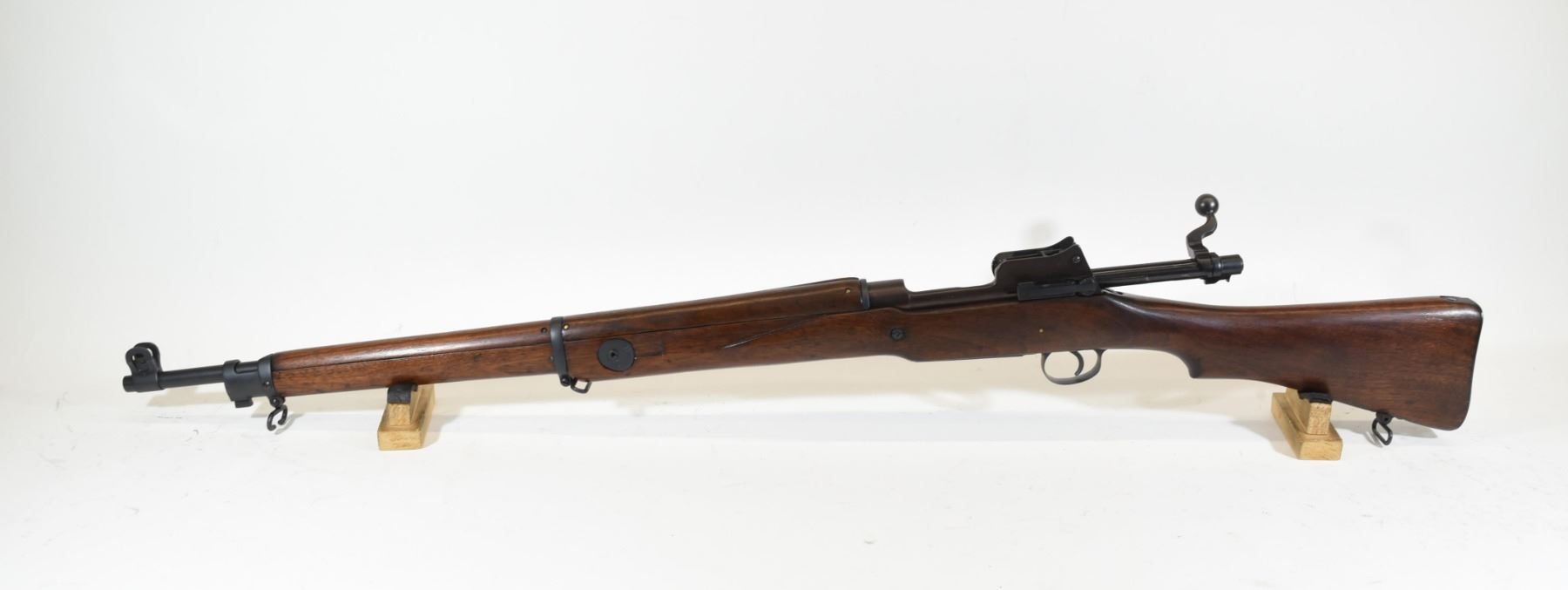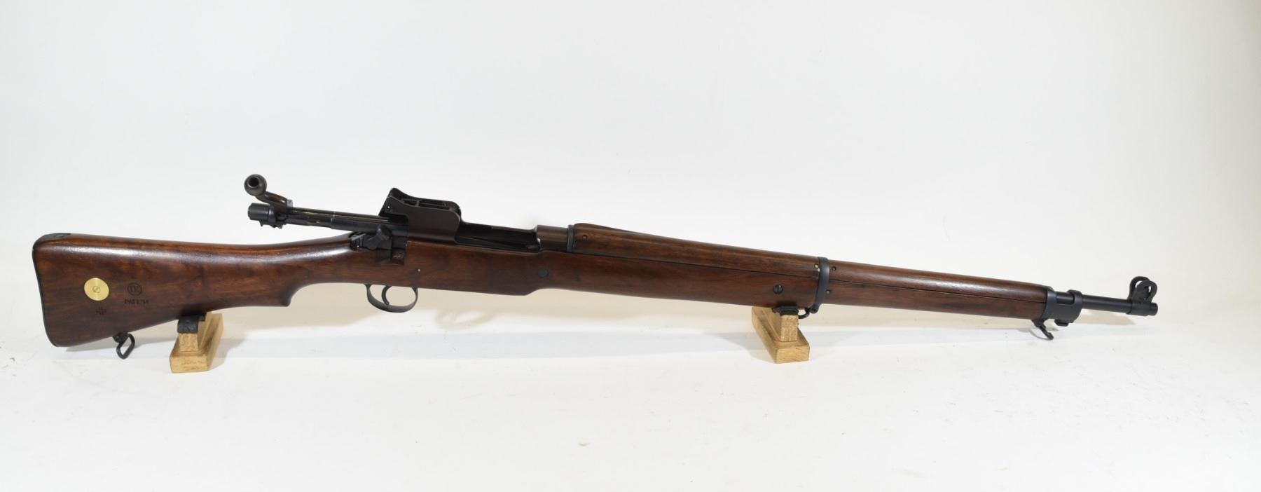 Non-restricted, bolt action, 303 British, 26" barrel, SN 5705. Wood and bluing appear refinished, bore stained from corrosive ammo and rifling is prominent.