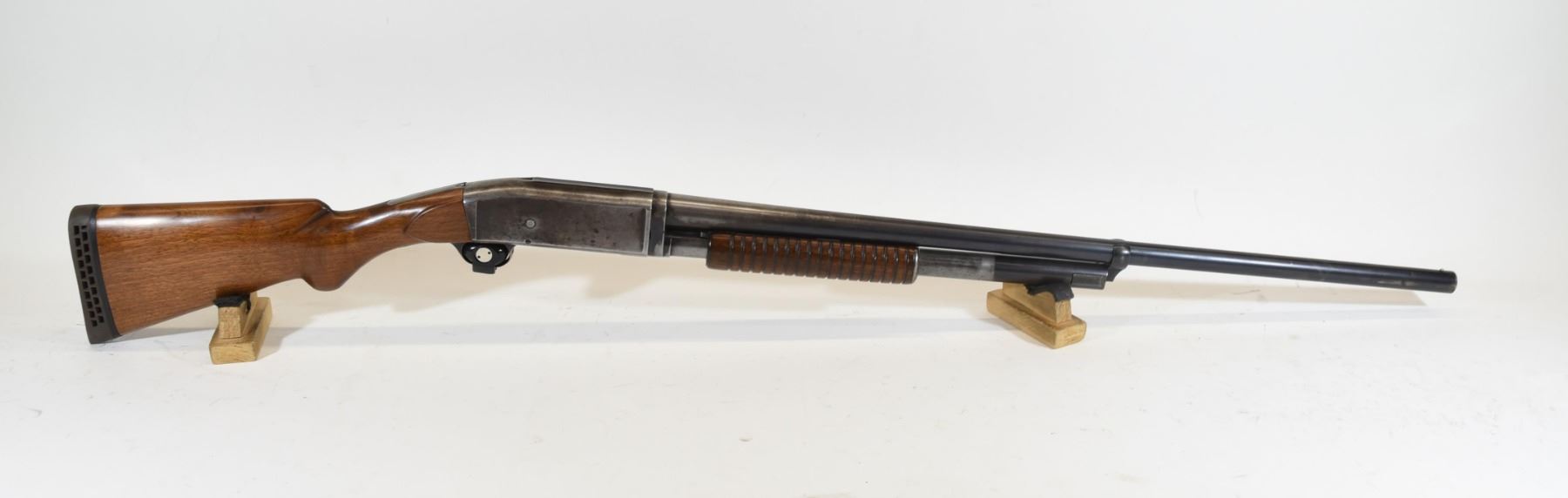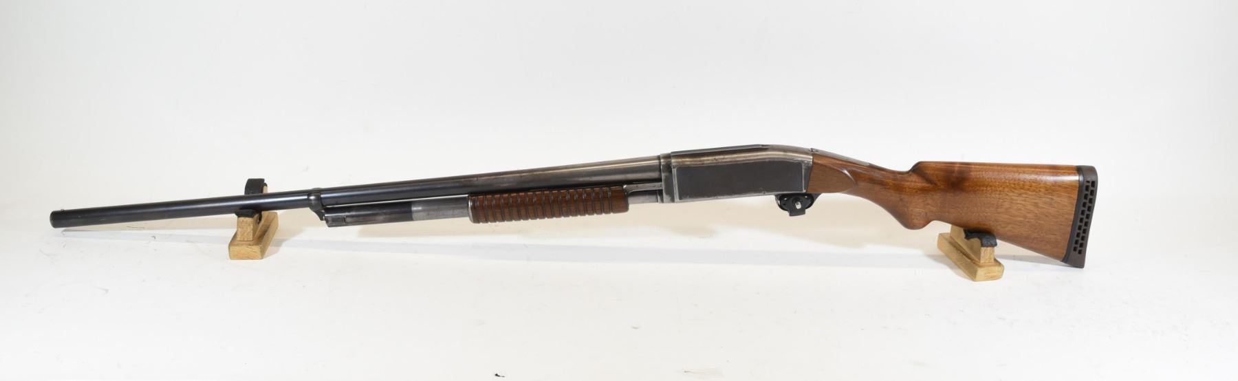 Non-restricted, pump action, 12 Ga x 2 3/4", 30" barrel with fixed full choke, SN 64246. Wood refinished, bluing is grey and turning brown on receiver, bore very good.