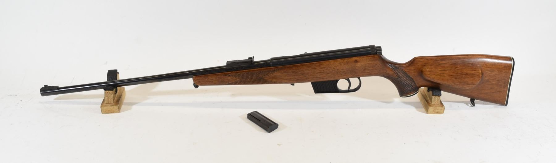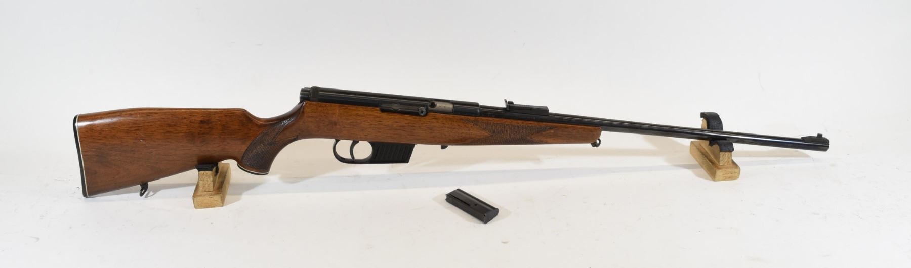 Non-restricted, semi auto, 22 LR, 21 1/4" barrel, SN 152033. Wood has a couple dents and scratches, bluing good, bore excellent. Charge handle not original.