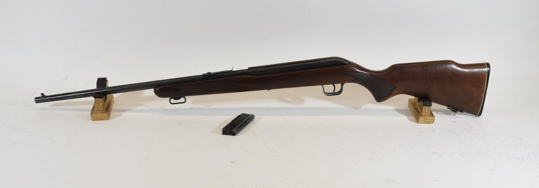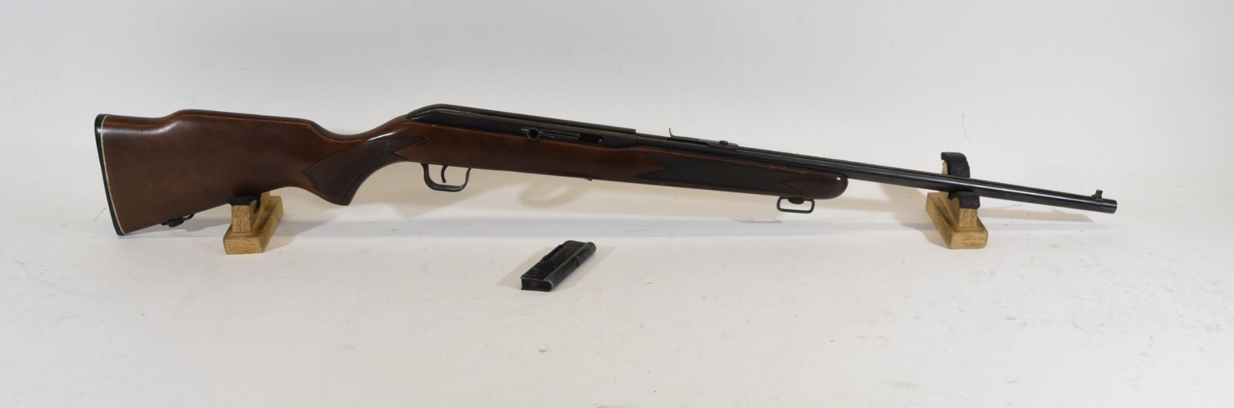 Non-restricted, semi auto, 22 LR, 20" barrel, SN CA034270. Wood has a few marks, bluing has light pitting all over, mag is grey, bore excellent.