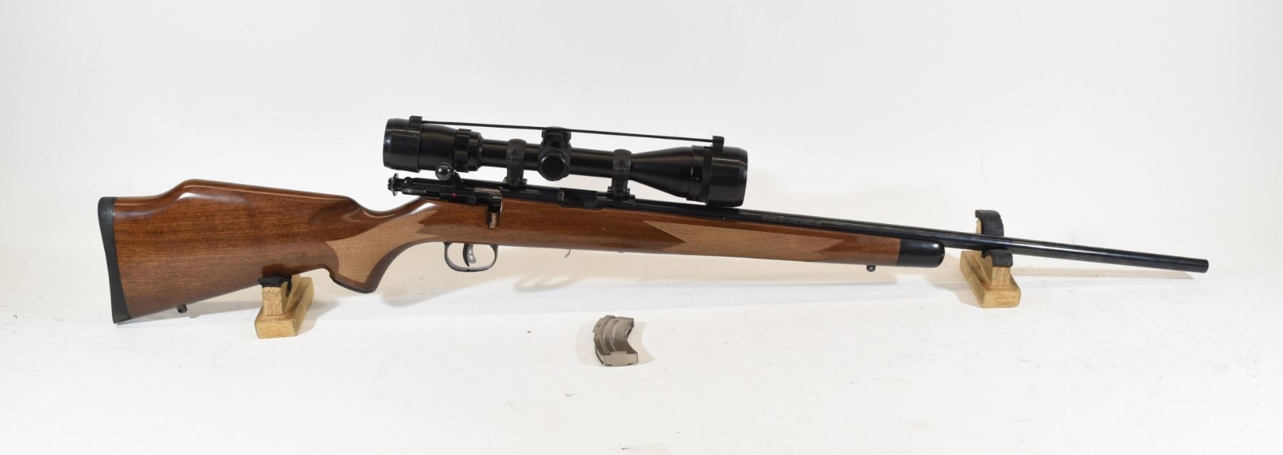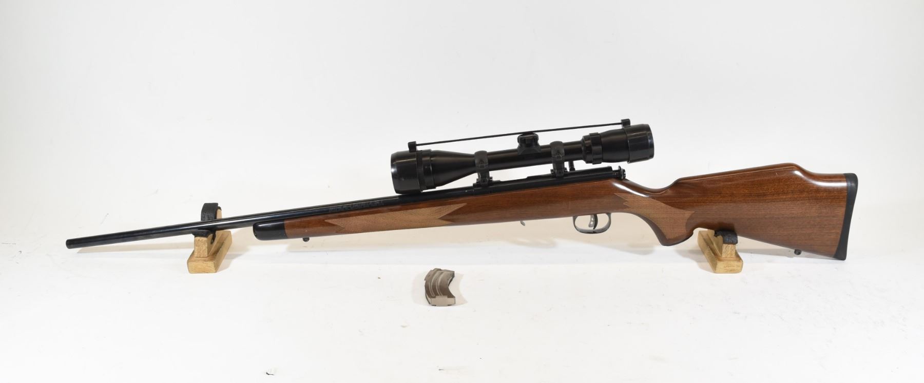 non restricted, bolt action, 22 lr only, 24" barrel, SN G697371, wood is very good, bluing is good, bore has some pitting on one side from the end of the muzzle down a couple inches, has a Bushnell Banner 4 - 12 x 40 scope.