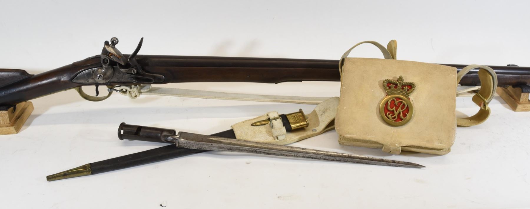 Antique, single shot, 75 caliber, 39" barrel, SN none, wood has a crack by trigger guard and butt stock by lower tang, a chip out of butt stock and forearm as well as some light srcatches and dents, bluing is brown, bore has corrosion, has a white leather sling, a leather ammo pouch with 3 round ball and a bayonet with the sheath, has Tower on right side plate