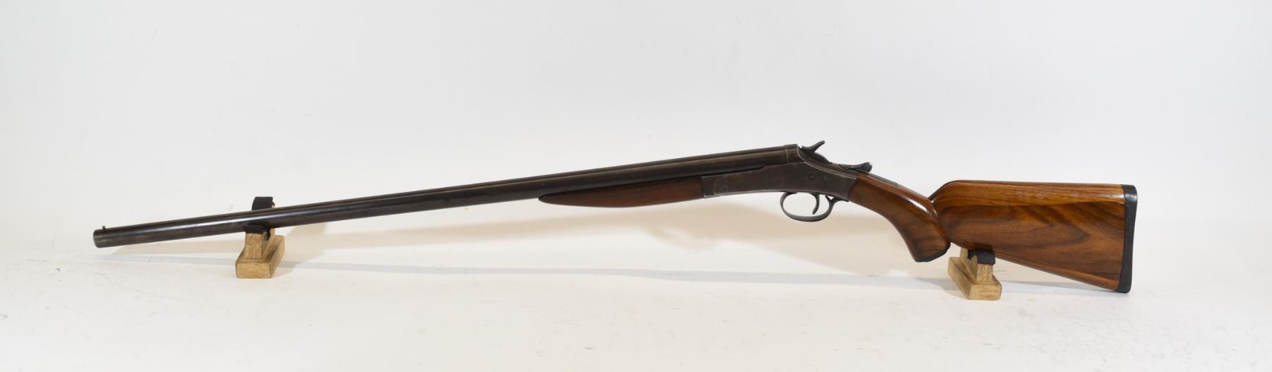 Non-restricted, single shot, break action 12 gauge x 2 3/4", 30" barrel with fixed choke (F), SN 1854. barrel is good, wood has some dents.