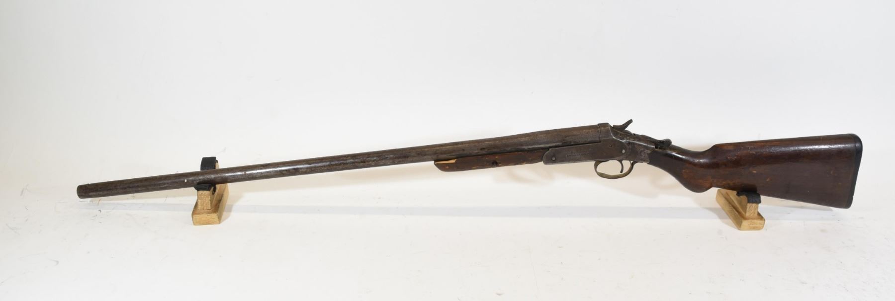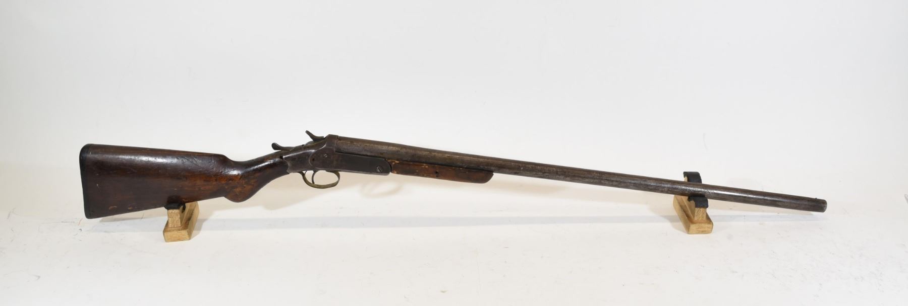 Non restricted, single shot, 12 gauge x 2 3/4", 30" full choke barrel, SN 1247, wood has numerous cracks and scratches and is in poor condition, bluing is brown & grey, bore has pitting