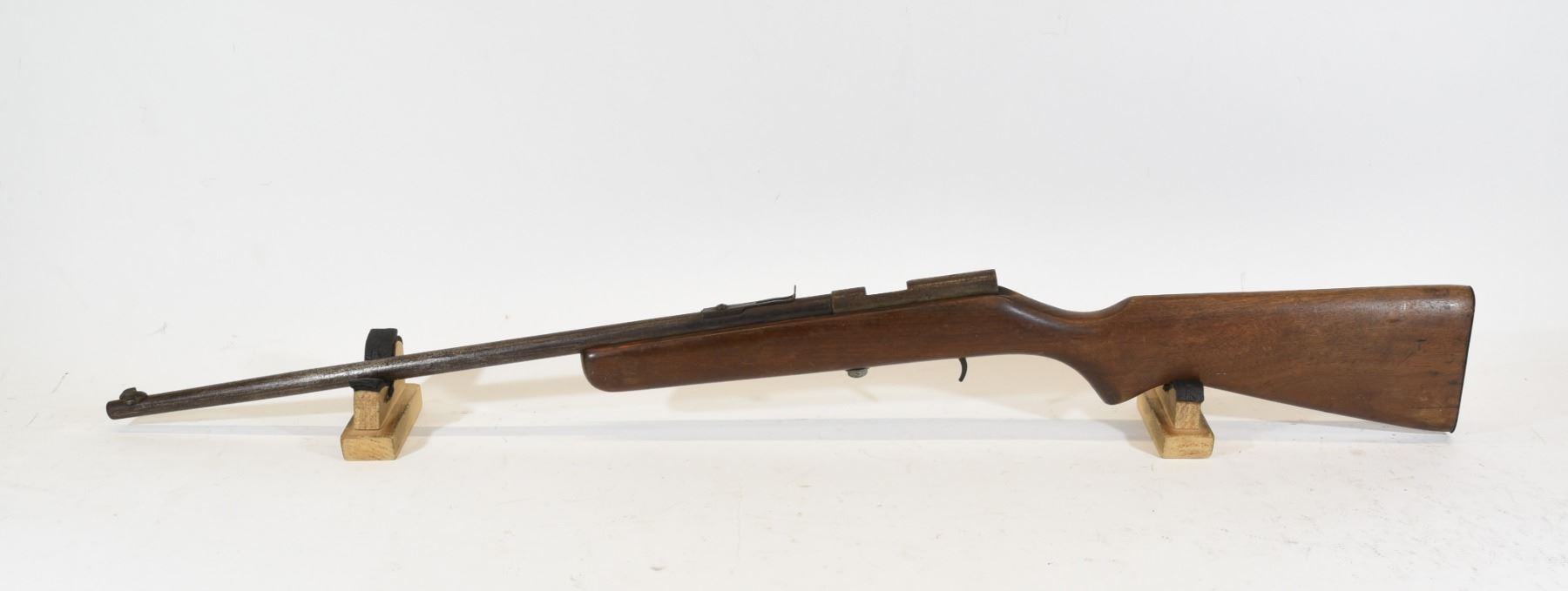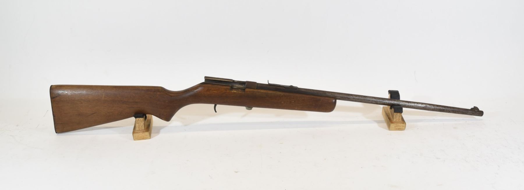 Non restricted, bolt action single shot, 22 caliber, 22" barrel, SN none, wood has a crack on both sides of the butt stock, bluing is brown and pitted, bore is very good, missing bolt and trigger guard.