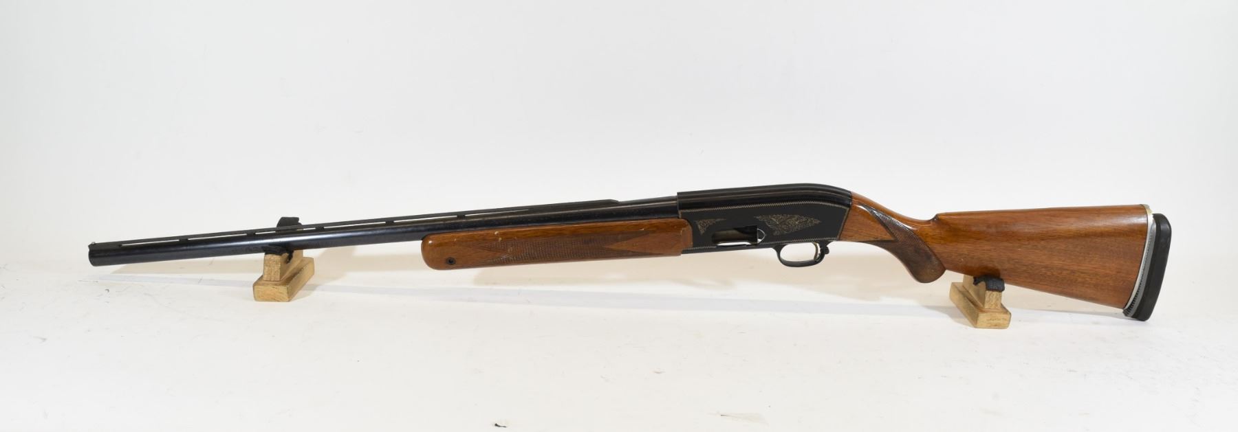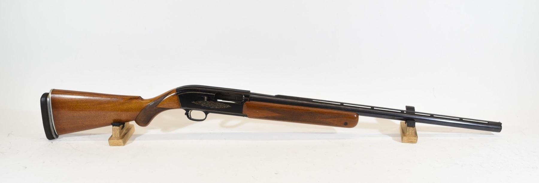 Non-restricted, semi auto, 12 Ga x 2 3/4", 25" barrel with skeet choke, SN 5A47534. Wood has a few dents and scratches, bluing has rust spots on outside of barrel and inside is good, receiver has some rub marks.