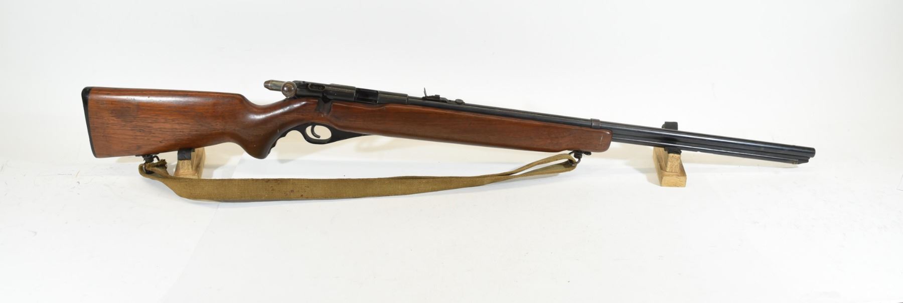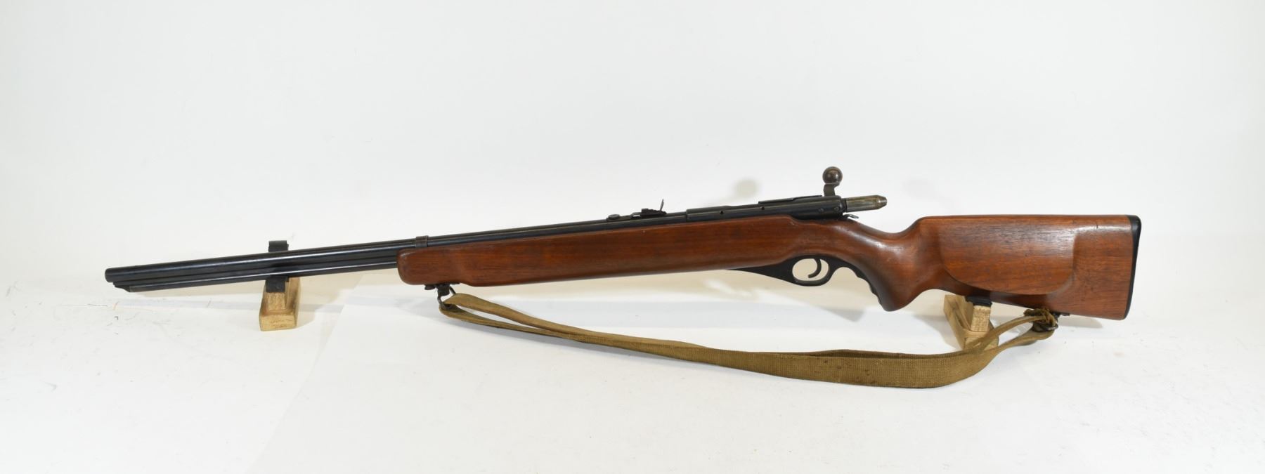 Non-restricted, bolt action, 22 LR, 26" barrel, Sn none. Wood has some denta and marks, bluing lightly pitted all over, bore excellent. Mag spring may be weak.