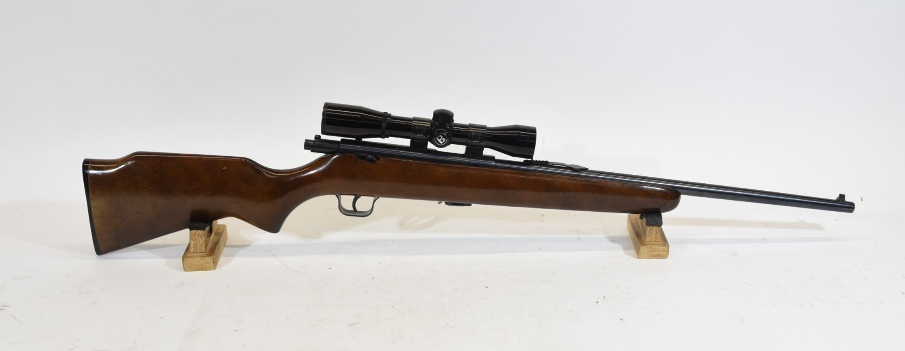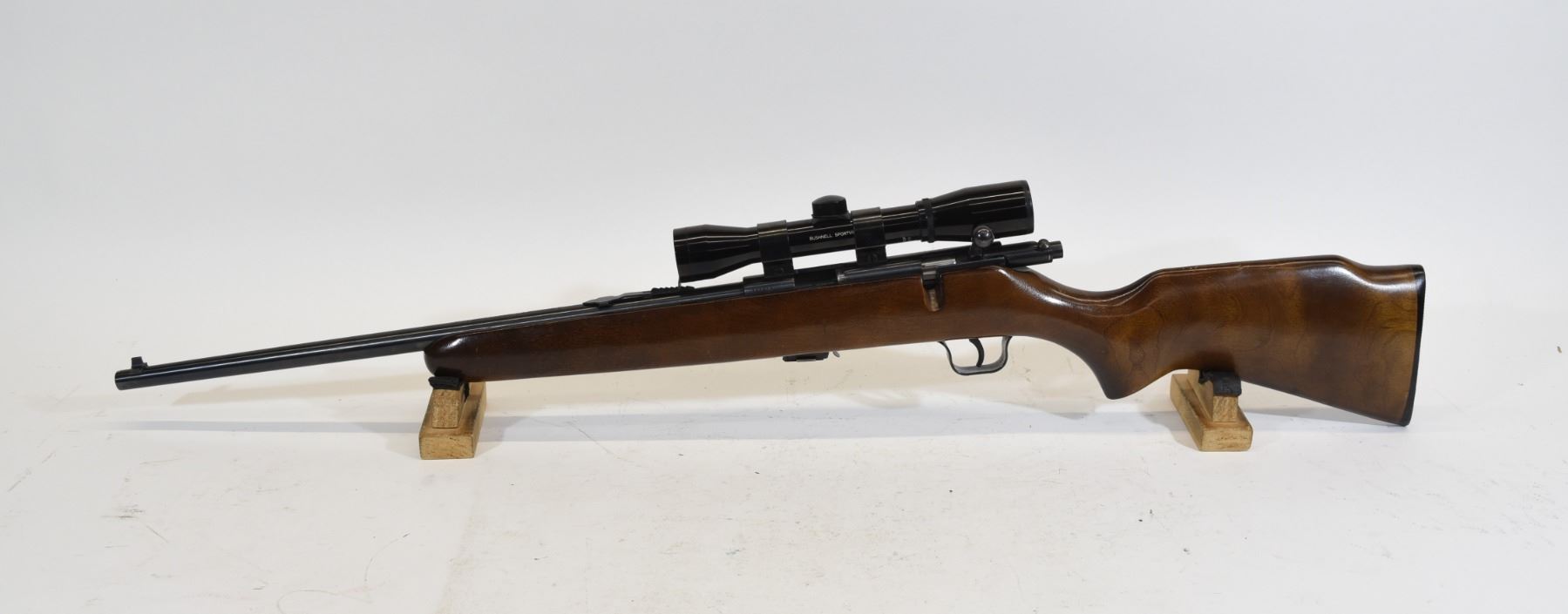 Non-restricted, bolt action, 22 LR, 19" barrel, SN 251654. Wood has a few scratches and marks, bluing and bore excellent. Comes with Bushnell Sportview 4 x 32 scope.