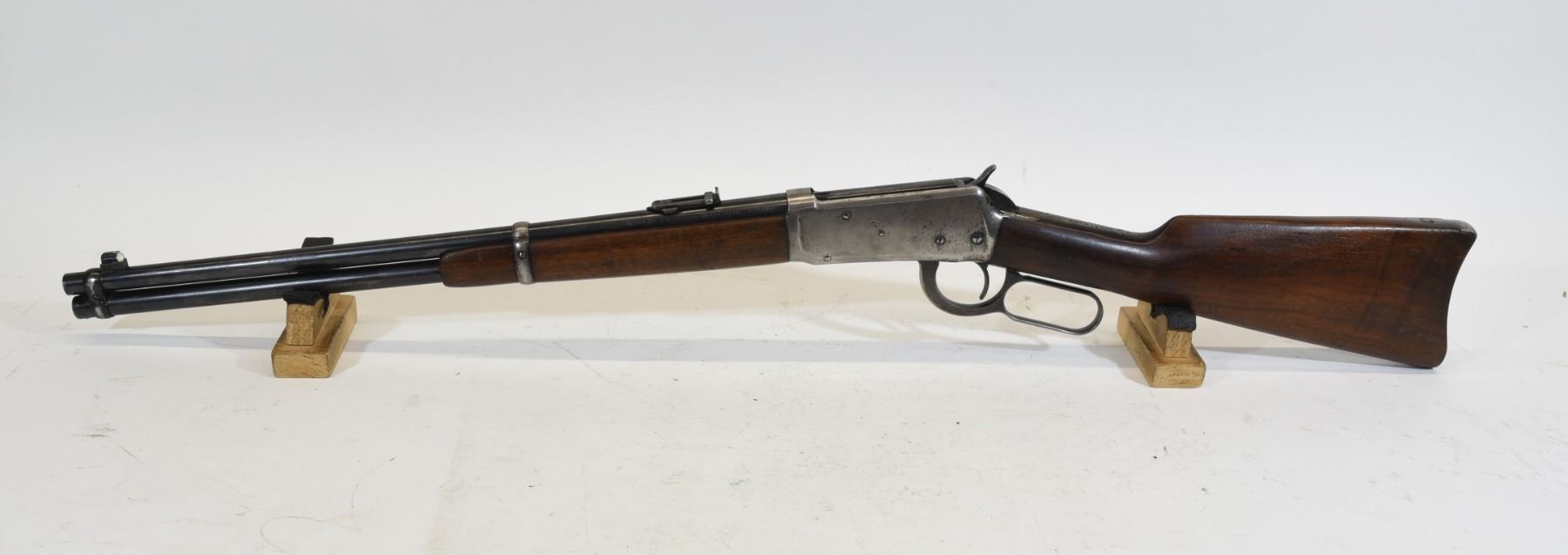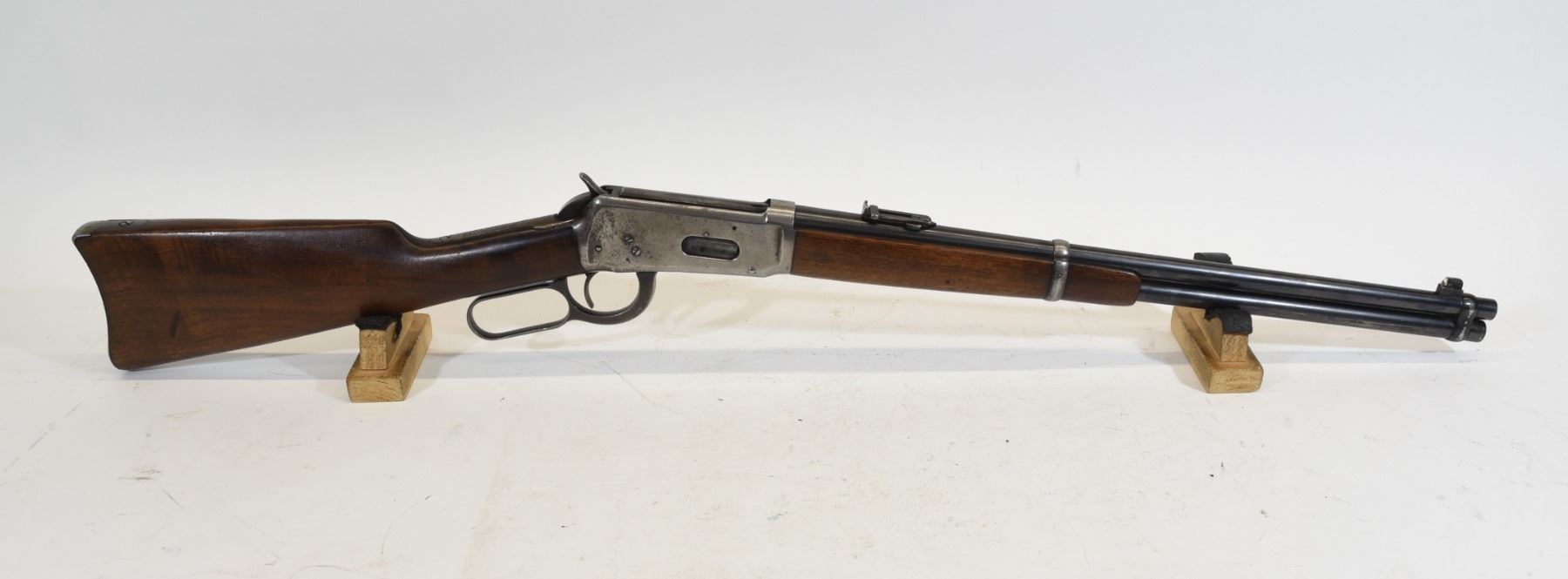 Non-restricted, lever action, 30 WCF, 20" barrel, SN 1048418. Wood has a couple deep dents, numerous scratches and marks, bluing is grey on receiver, barrel has marks and scratches, bore excellent.