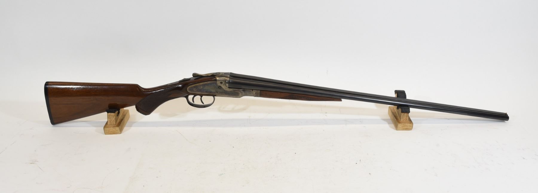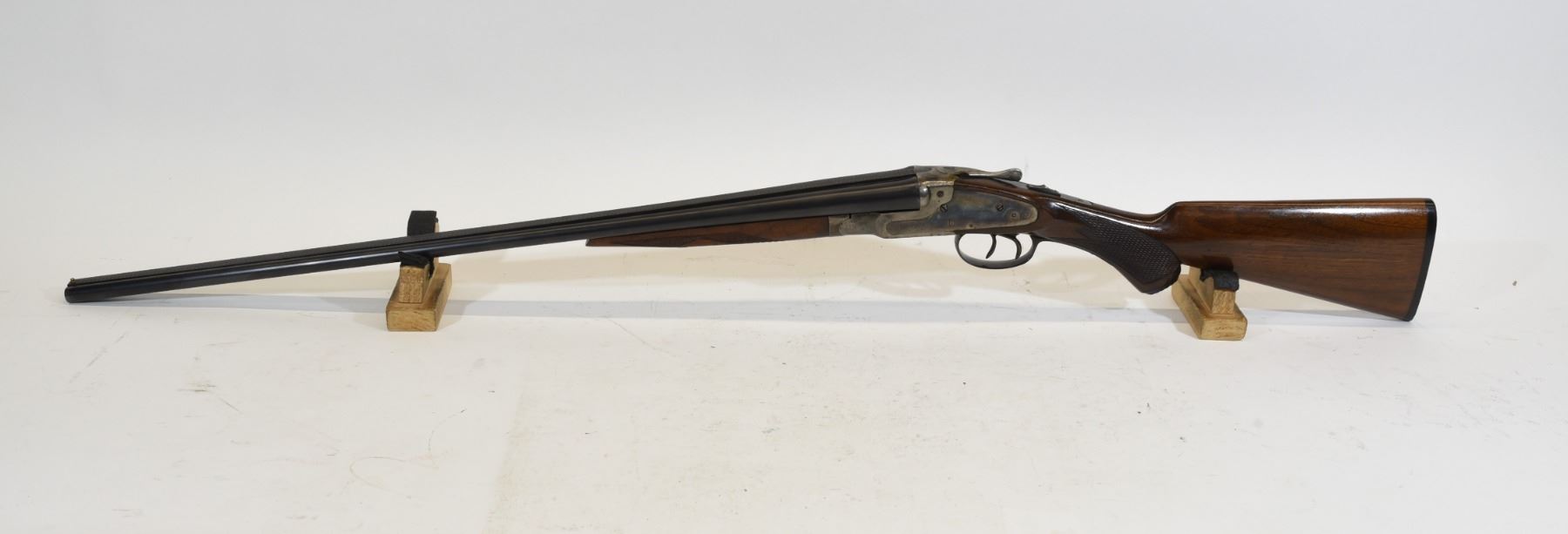 Non-restricted, multi barrel, 410 Ga x 2 3/4", 26" barrel with fixed full chokes, SN 9127. Wood has a crack behind receiver left side, bluing grey on receiver, bores good.