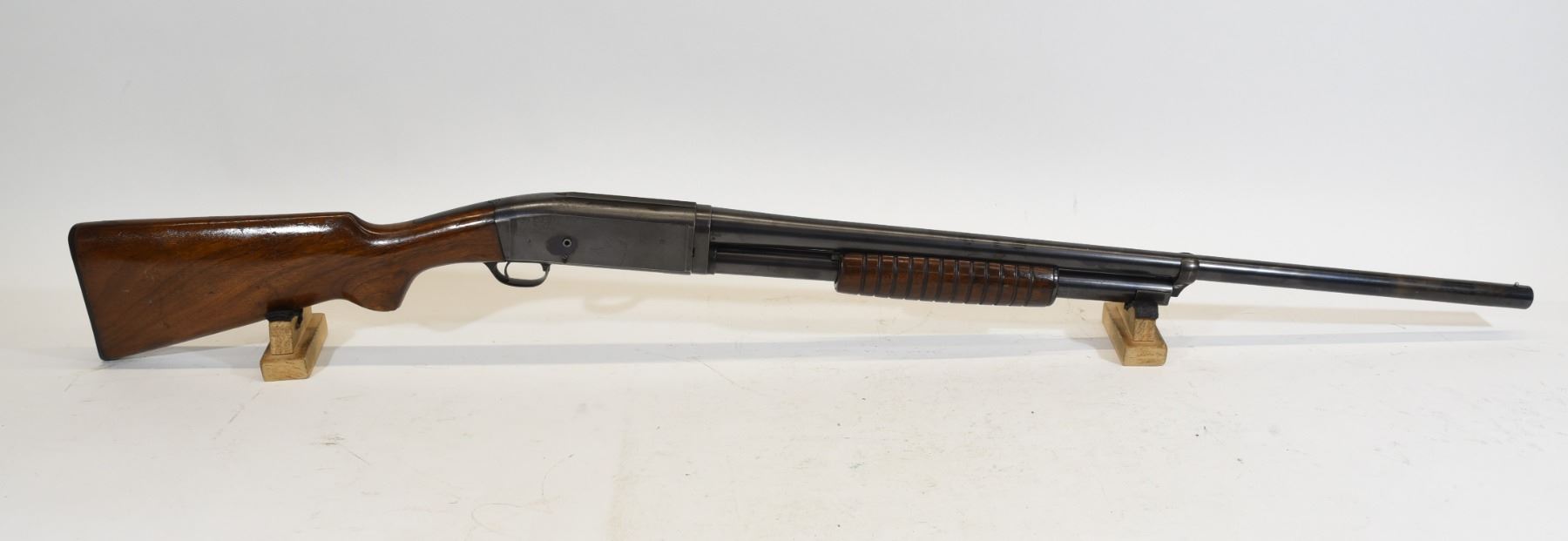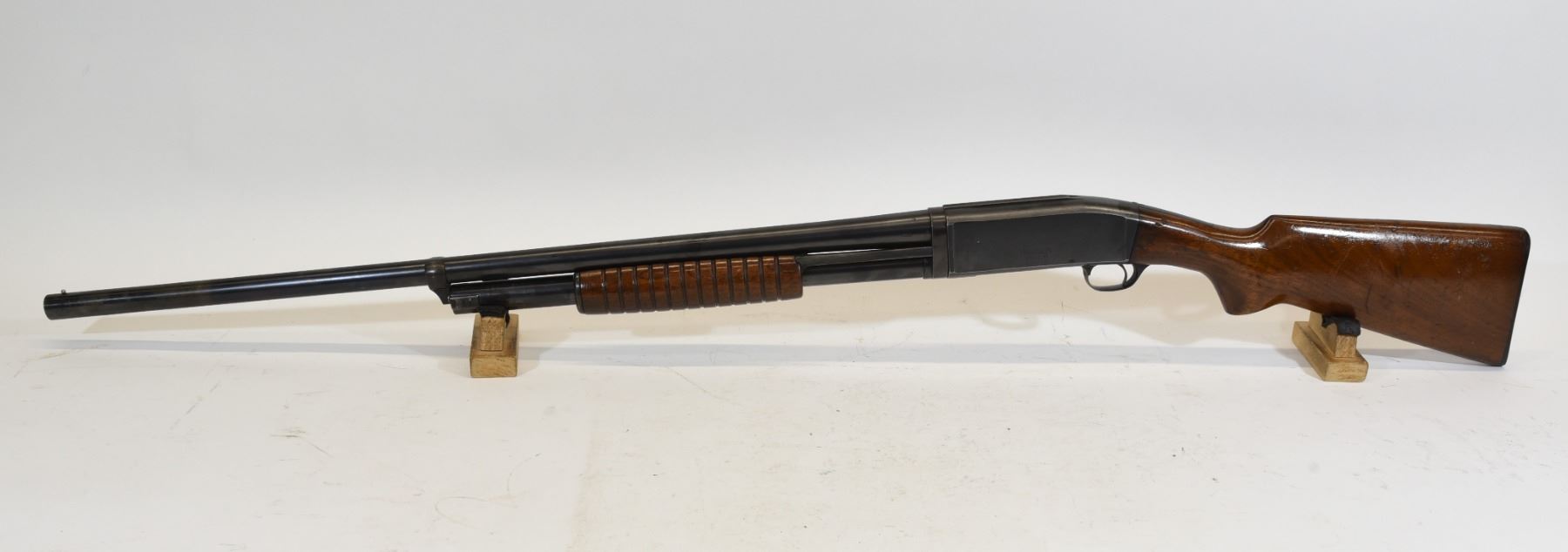 Non-restricted, pump action, 12 Ga x 2 3/4", 30" barrel with fixed full choke, SN 272082. Wood has dents marks and a chip, bluing faded with scratches and marks, bore excellent.