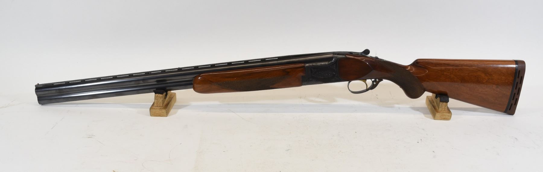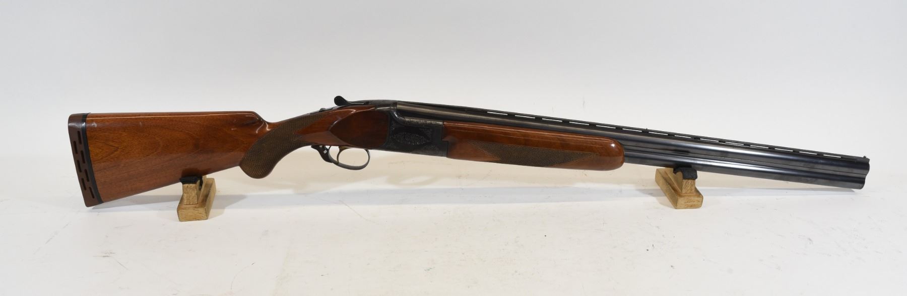 Non-restricted, multi barrel, 12 Ga x 2 3/4", 26" barrels with fixed chokes (Skt, Skt), SN 392366. Wood has a couple scratches and marks, bluing worn under reciever, rust on trigger guard, bores excellent.