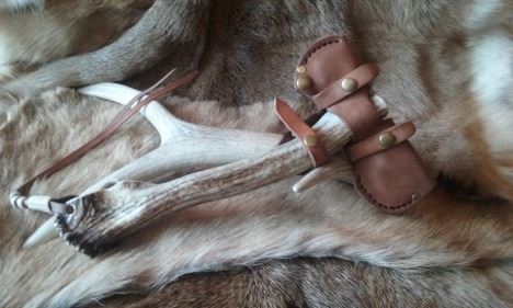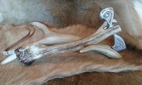Lance DuBois, a 5th generation Montanan, is a sculptor, painter, illustrator, knife maker, cowboy poet and folklorist. Portraiture, wildlife and western themes are the focal point of his art. His knife making is his passion, and his art and poetry depict the legends, humor and romance of the West. This War Hawk has a curved spring-steel head, etched with a flowering thorny scroll design, and is gun blued. The head is semi heat treated and tempered, honed and sharpened. The handle is elk antler, mortised, and epoxy stabilized, with embedded, threaded rod. The leather sheath is saddle leather, double stitched, and snapped, oiled and saddle soaped. The leather thong, has sleeved elk tips. This is a collector's replication, of a fighting war tomahawk. 406-727-0281 www.runningwolffineart.com We thank Lance DuBoise for this Donation. VALUE: $375.00