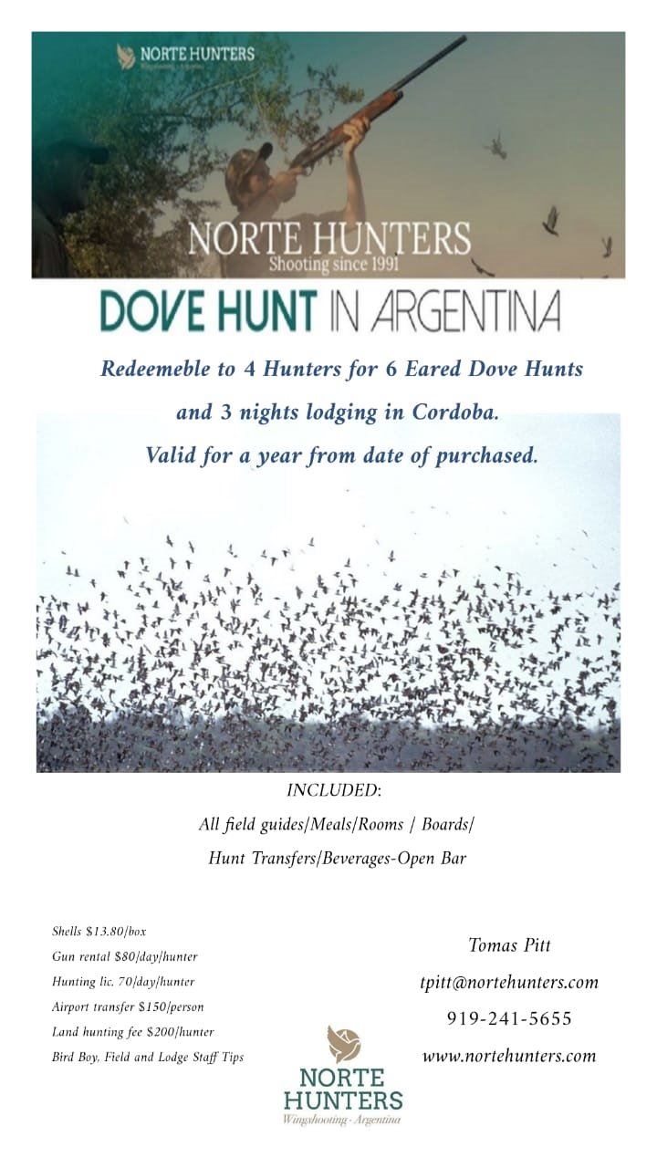 - Four (4) hunt spots for three (3) hunting days in Cordoba, Argentina