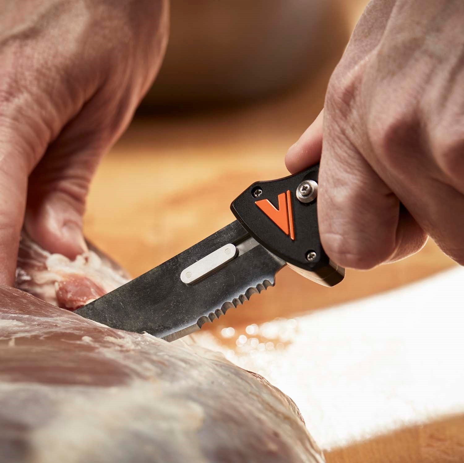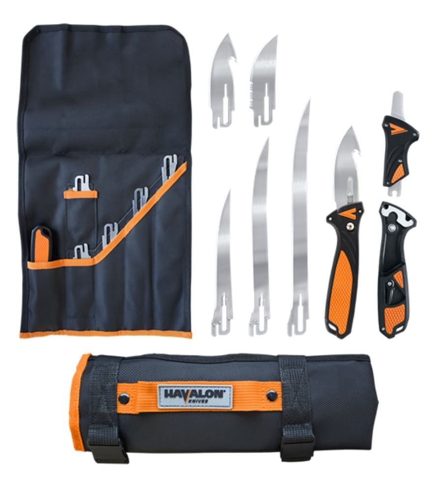 The latest innovation from Havalon is here. Introducing the new Havalon Talon featuring the Quik-Change II Interchangeable Cutlery System. Quik-Change II is an internal locking mechanism which allows users to seamlessly change blades without losing any cutting area. The Talon’s adaptable design allows it to fit any style Talon blade big or small with the press of a button. The Talon also features a removable back panel for easy clean up after filleting or processing, and it comes with a rugged nylon roll-pack to store a variety of blade styles and sizes. With an infinite list of uses and possibilities, the Talon is the next evolution in cutlery.