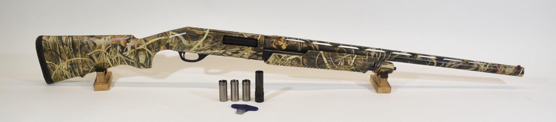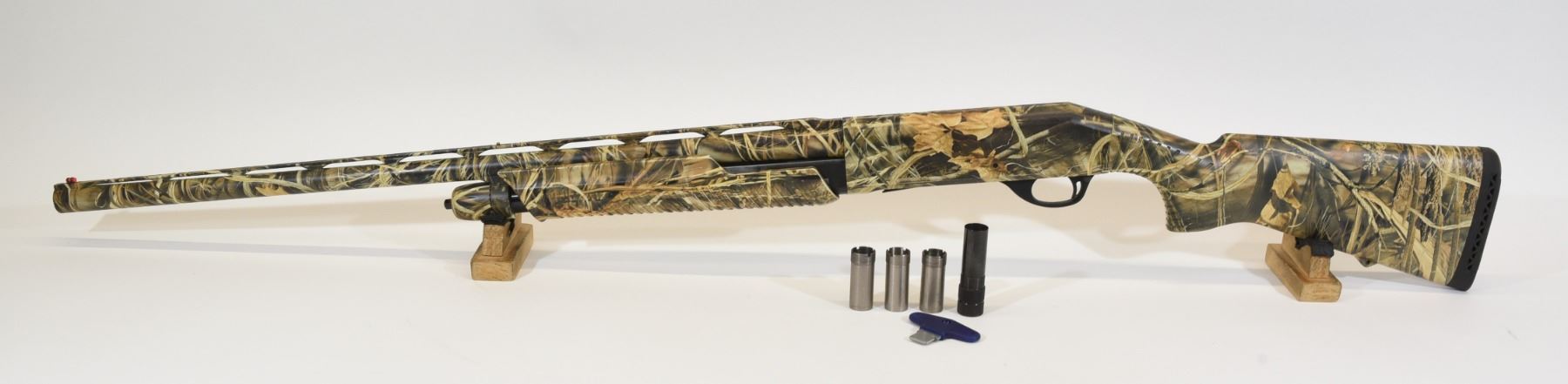 Non-restricted, pump action, 12 Ga x 3 1/2", 28" barrel with removable chokes (F,M,IC,Cyl,Undertaker), Synthetic stock with Advantage Max4 camo finish has some minor wear from usage, bore excellent.