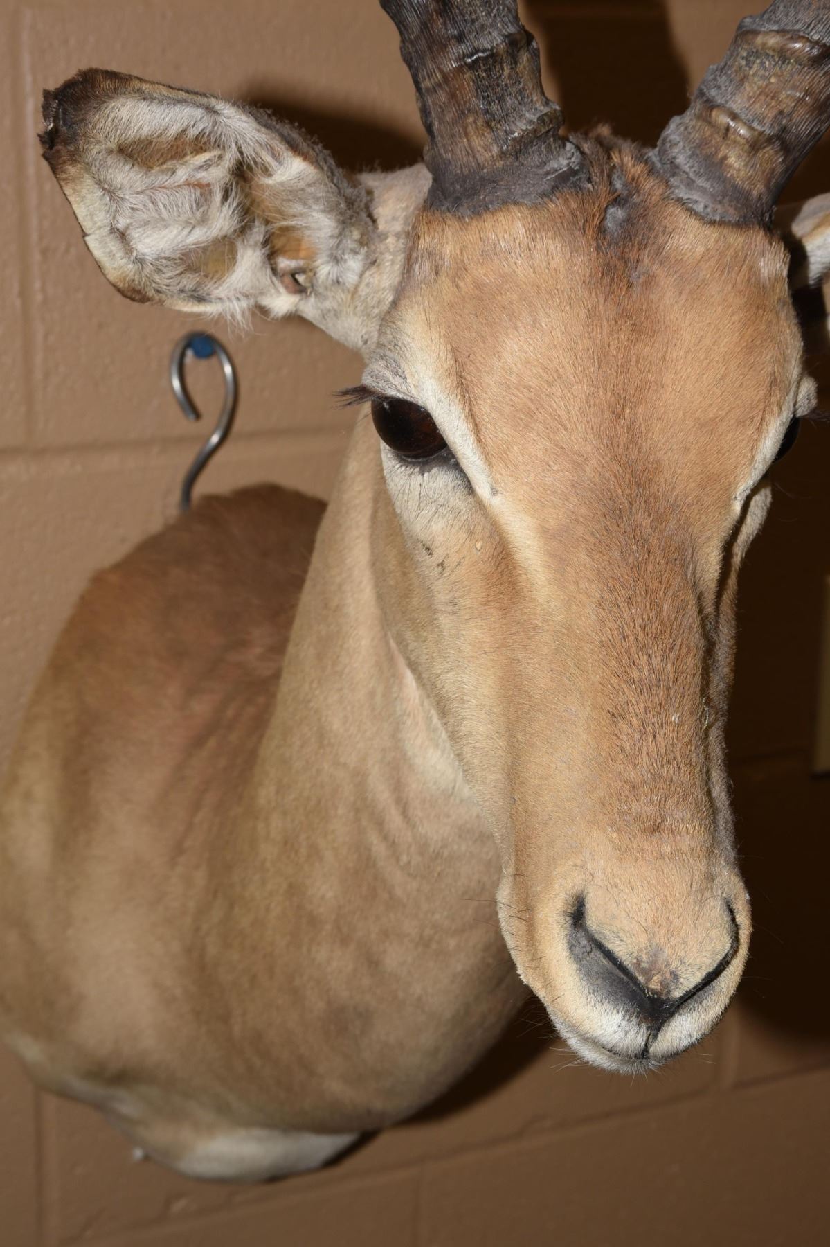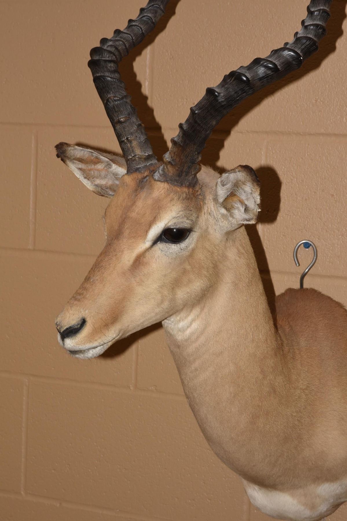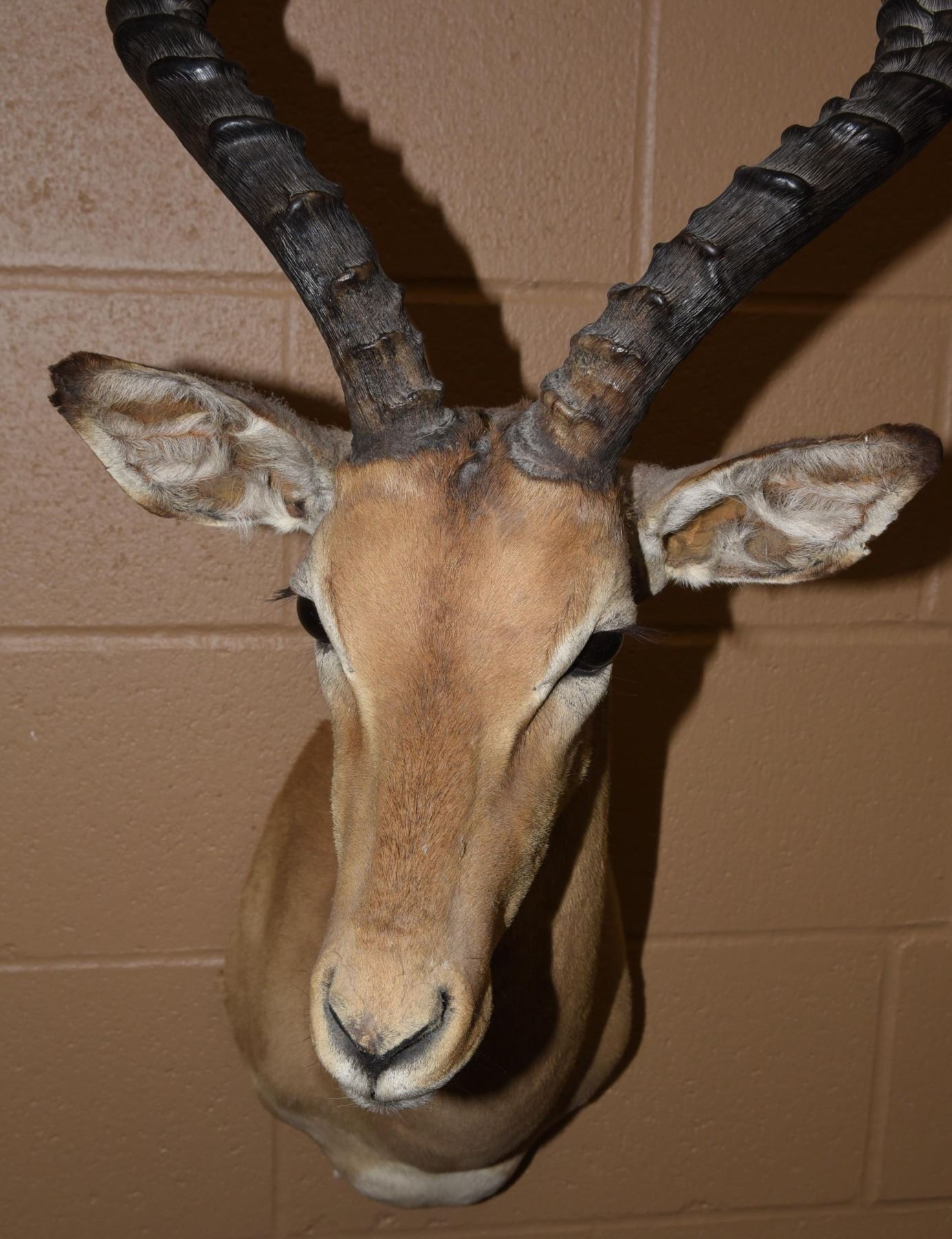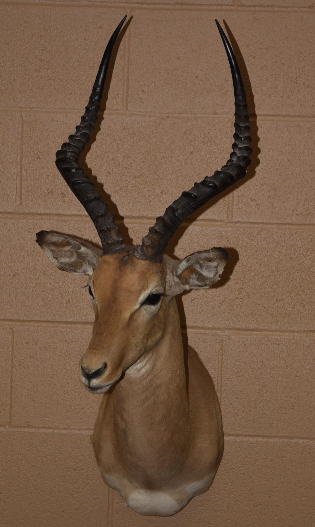 Will not ship.African Impala shoulder taxidermy mount. It is posed with the head in an upright position looking slightly to the animal's right side out into the room. This impala has a good set of symmetrical horns, measures 34"h x 22"d x 15"w, antlers measure 19" with the curl.