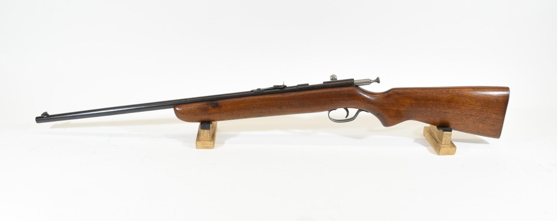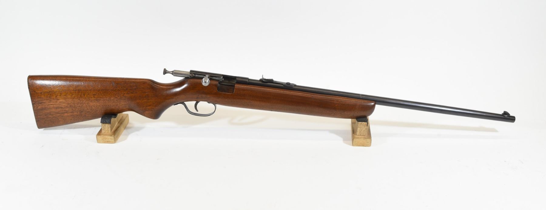 Non-restricted, single shot, 22 LR, 22" barrel, SN none. Wood has numerous scratches and marks, bluing has light pitting, bore good.