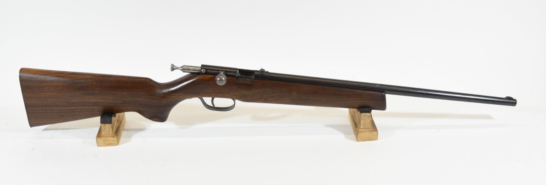 Non-restricted, single shot, 22 LR, 18" barrel, SN none. Wood refinished, bluing has pit marks, bore good.