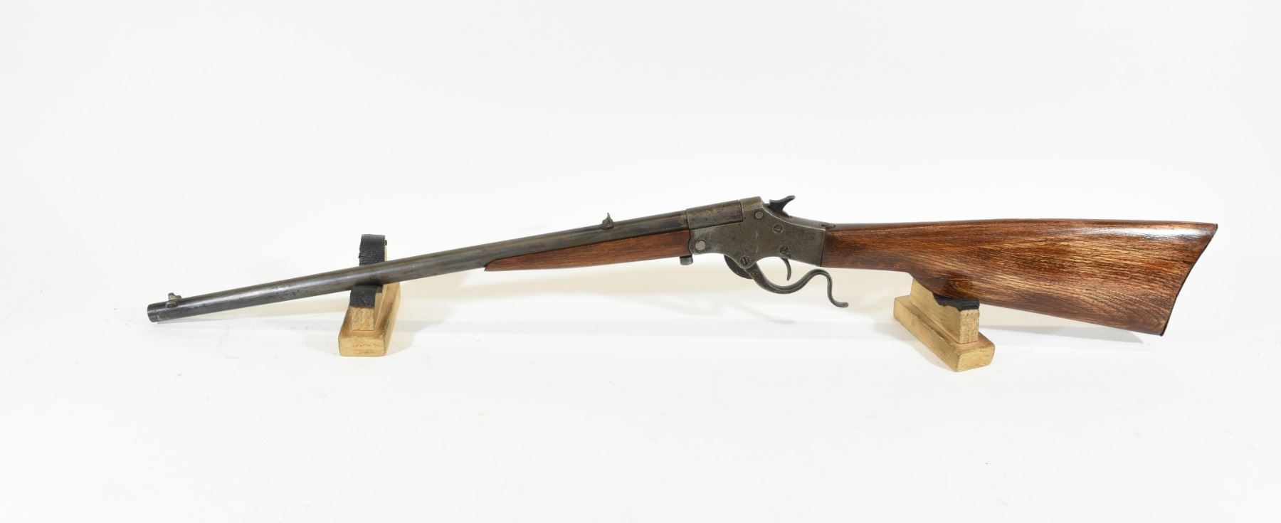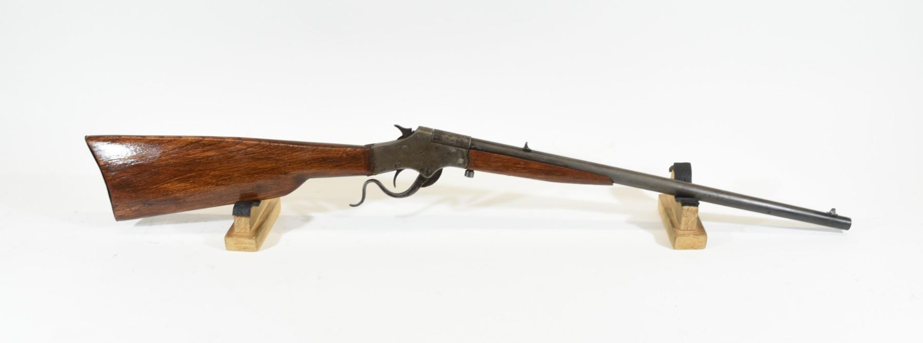 Non-restricted, single shot, 22 LR, 19" barrel, SN B644. Wood refinished, bluing is turning brown, bore very good.