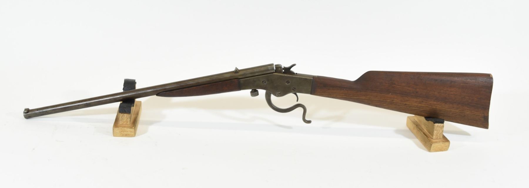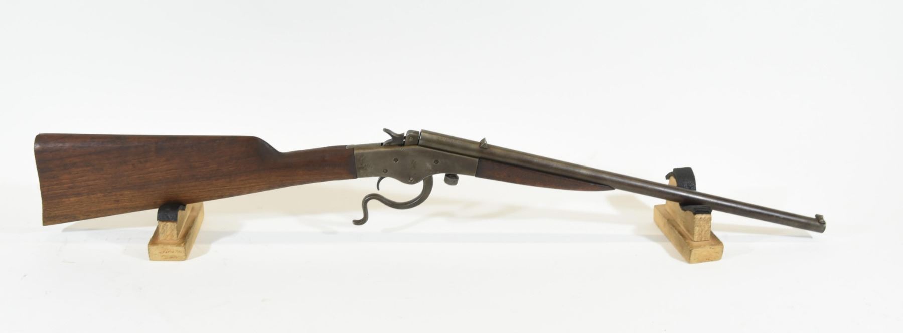 Non-restricted, single shot, 32 Long RF, 17" barrel, SN none. Wood has a chip, bluing turning brown, bore pitted.