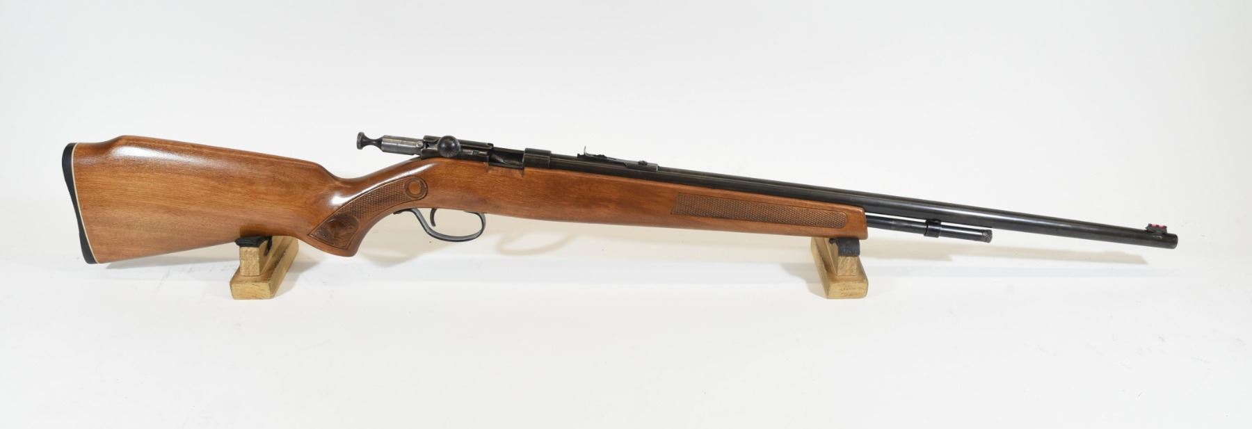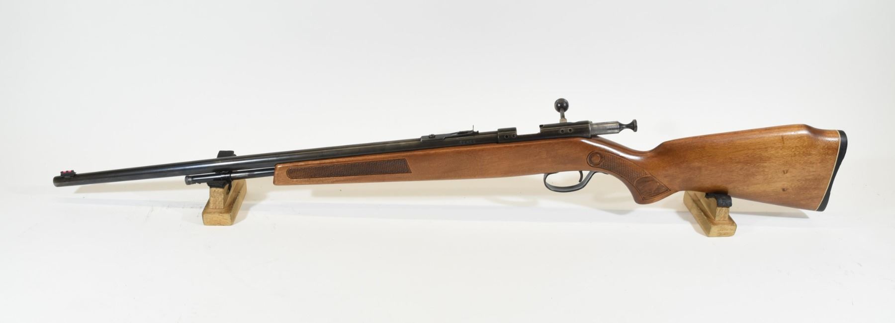 Non-restricted, bolt action, 22 magnum, 24" barrel, SN none. Wood has a dent, bluing is grey with some pitting, bore very good. Rechambered to 22 magnum by Ellwood Epps.