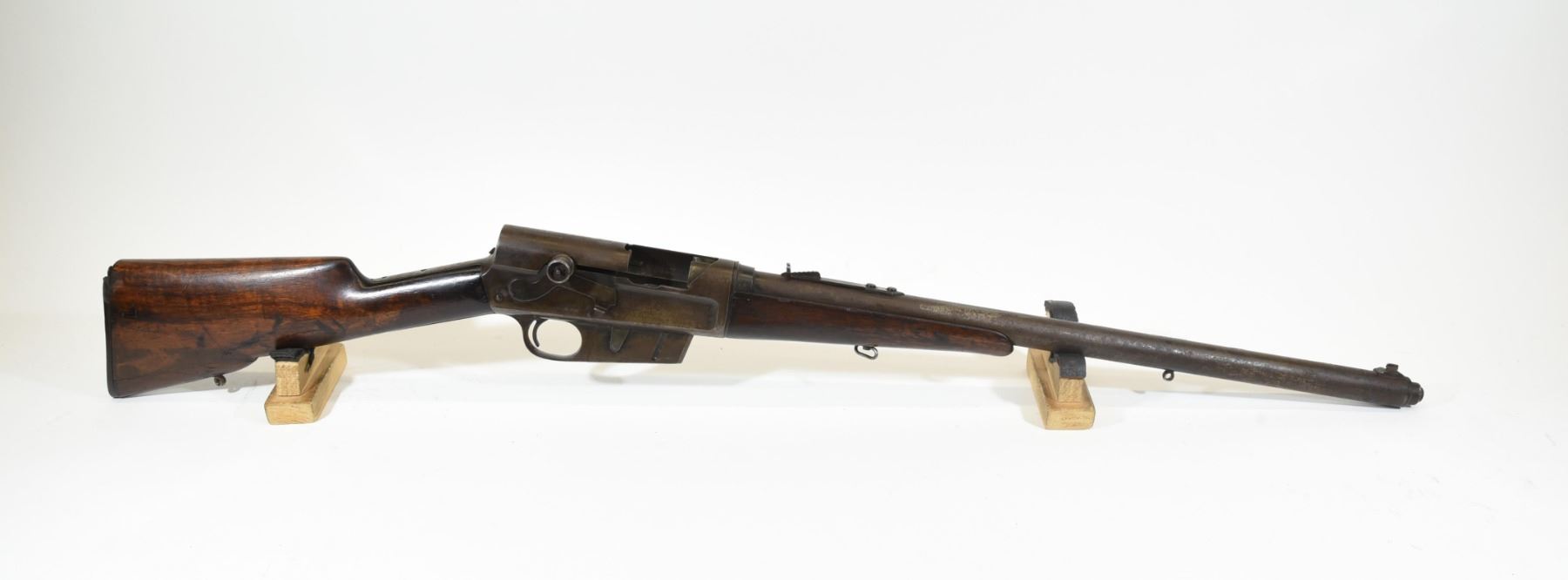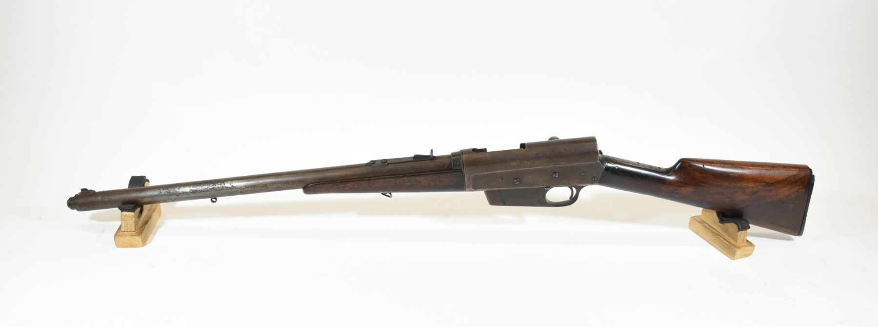 Non-restricted, semi auto, 35 Rem, 22" barrel, SN 22027. Wood has dents, gouges, cracks, repairs, bluing is rusted, bore very good. Butt plate broken.