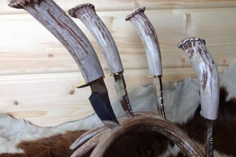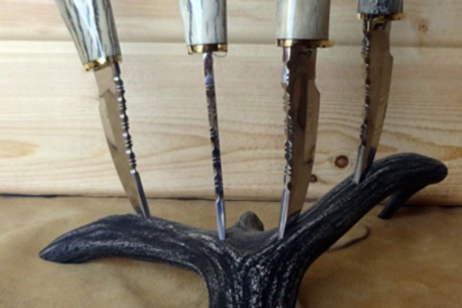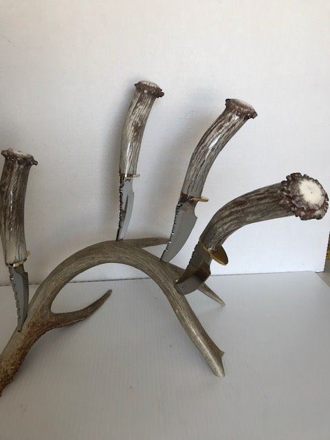 Horns for Heroes steak knives are not your average steak knives. Every set is unique because the set base and knife handles are from deer antler sheds. These Horns for Heroes are custom-made, hand-crafted, antler knives that are works of art. This elegant four (4) piece steak knife set to share dinner with your closest friends. Horns for Heroes antler products are made or assembled by veterans and their families.