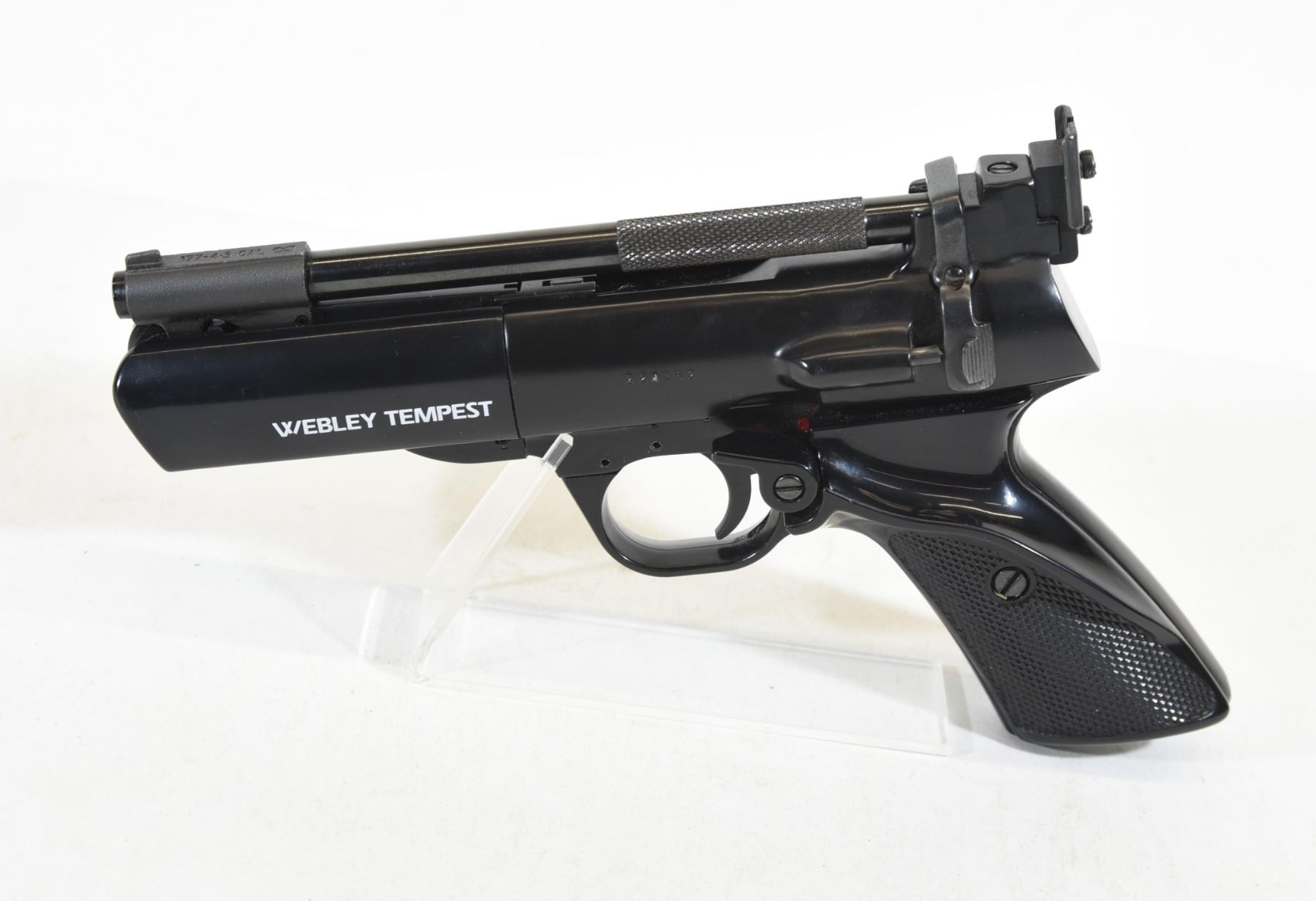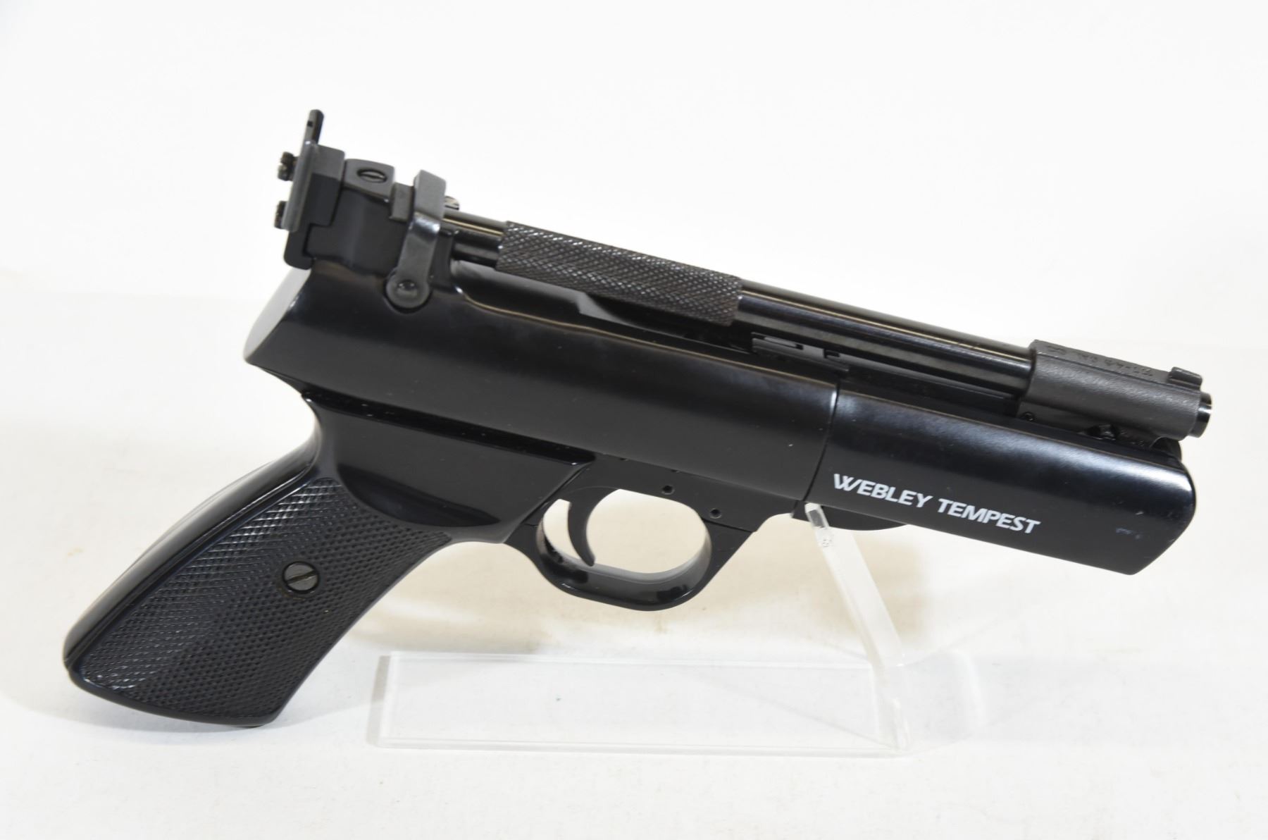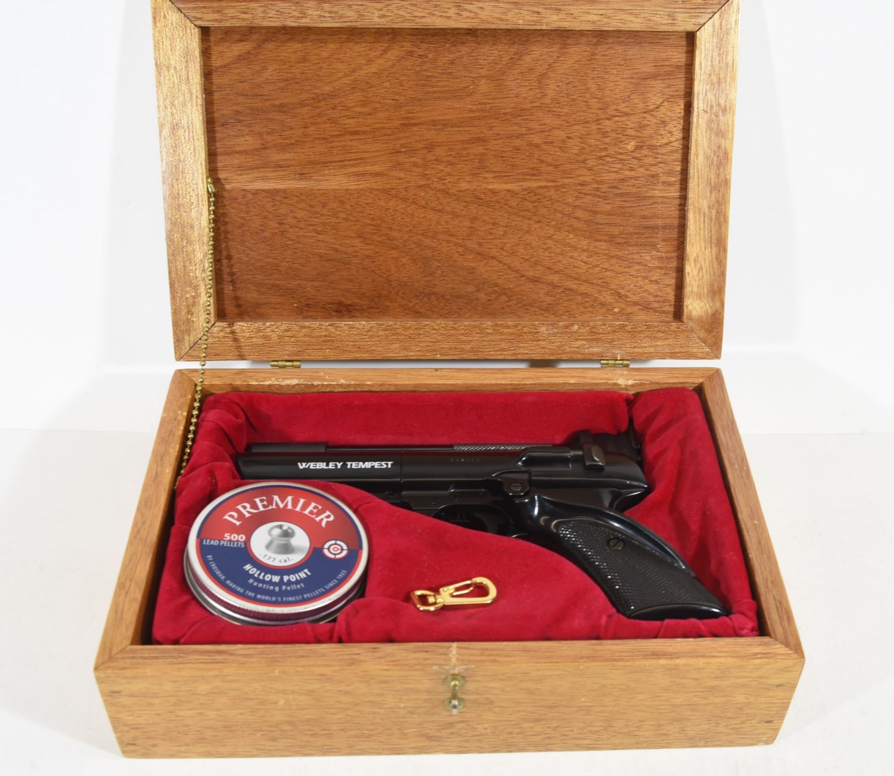 Under 500 FPS. There are a couple marks on the bluing otherwise excellent condition. 177 pellet. Comes with tin of pellets and wooden display box. Test fired OK with one pellet.