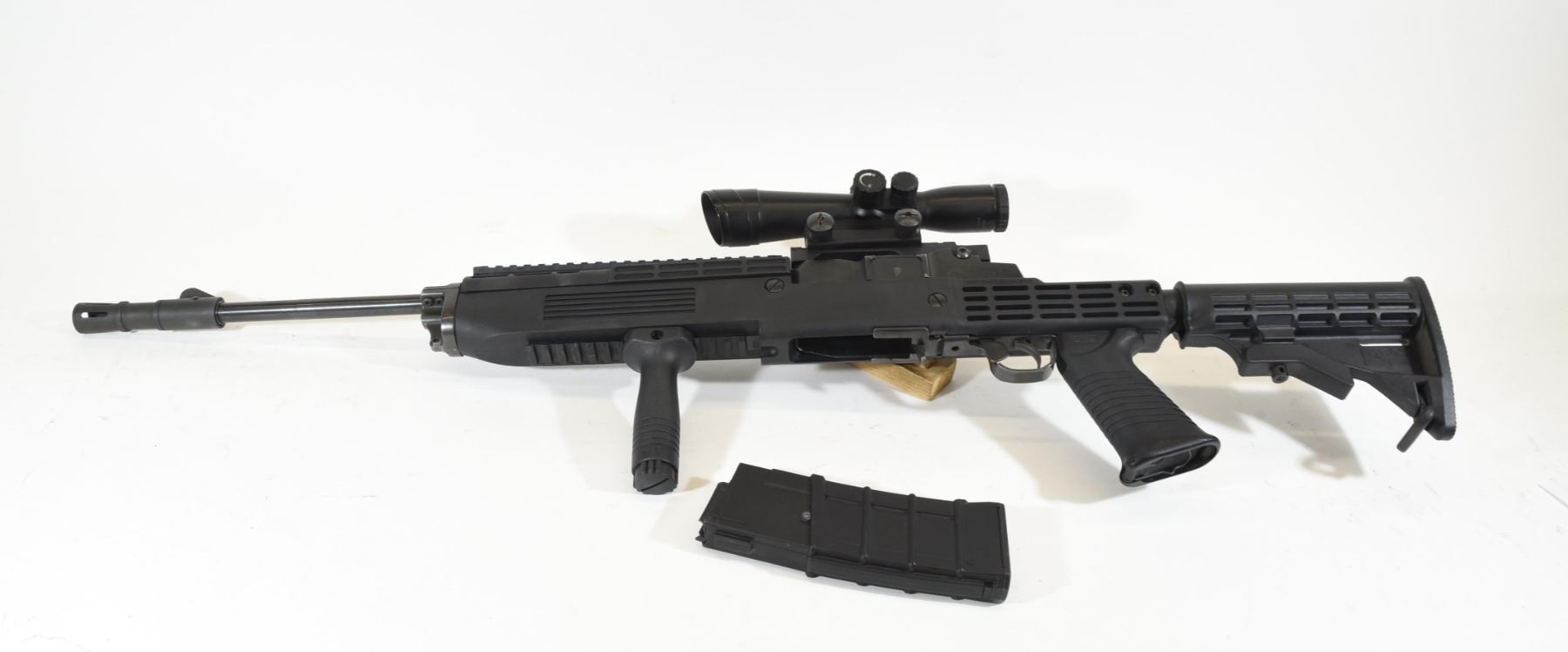 Non restricted, semi auto, 223 caliber, 20" barrel, SN 182-11063, Tapco stock in good condition, bluing is good, bore is excellent, has an Accushot scope with illuminated cross hairs, barrel has been machined for a muzzle break, muzzle break is just a little loose, has one magazine pinned to 5 rounds.