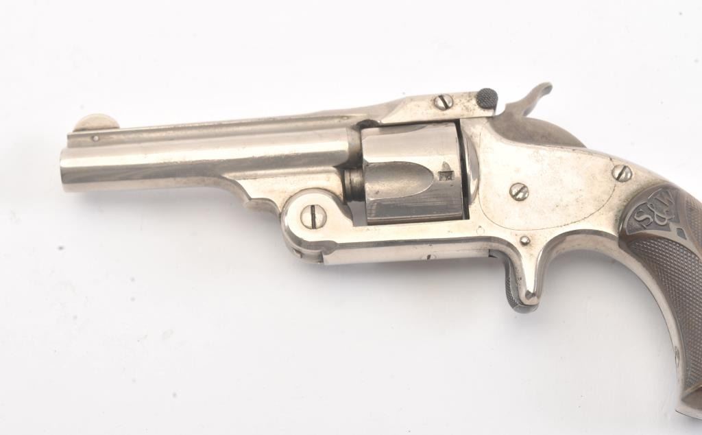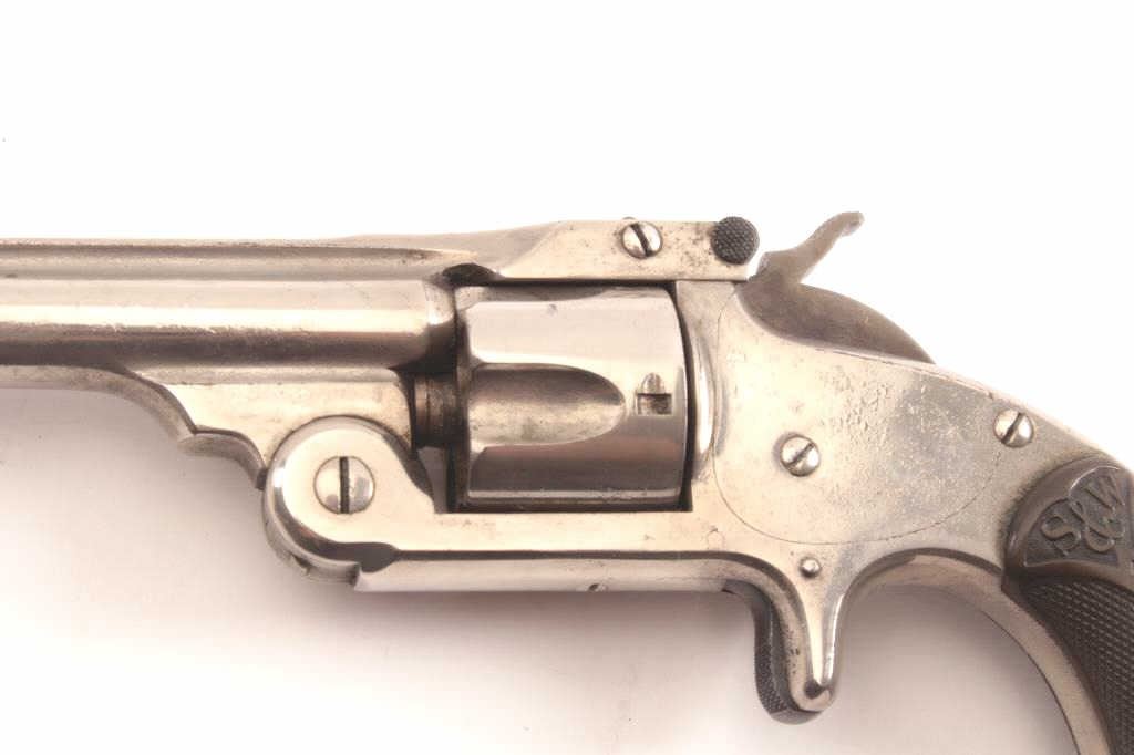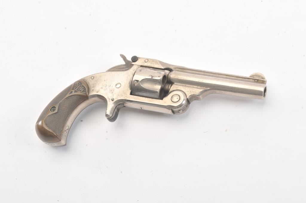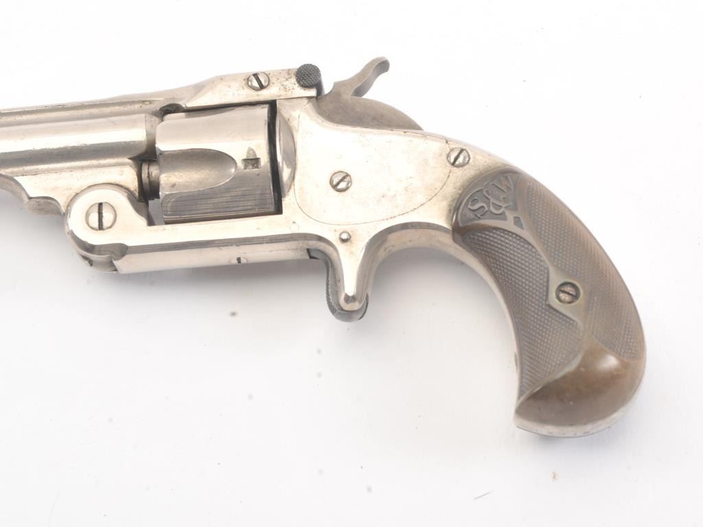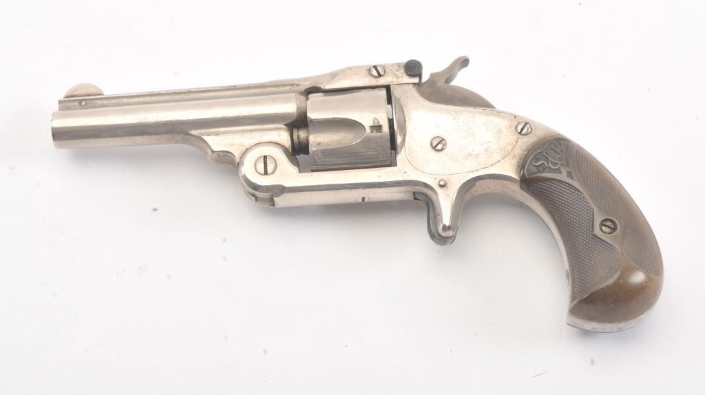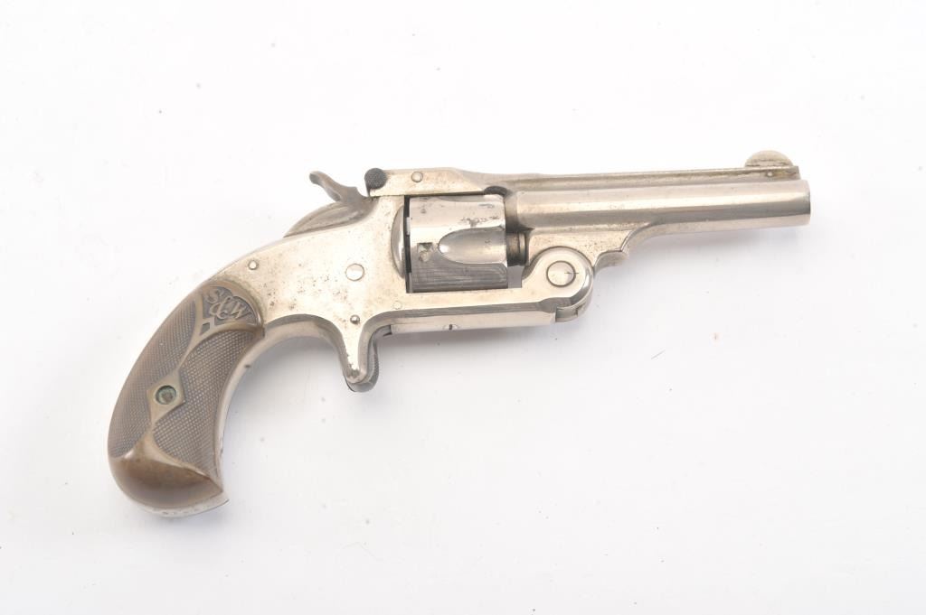 Smith & Wesson New Model .32 caliber single action revolver, S/N 25980 showing 85%-95% original nickel just beginning to “Bubble”. Good to very good markings and grips show edge wear from carry. Tight action and goodoverall. (Antique) Est.: $200-400