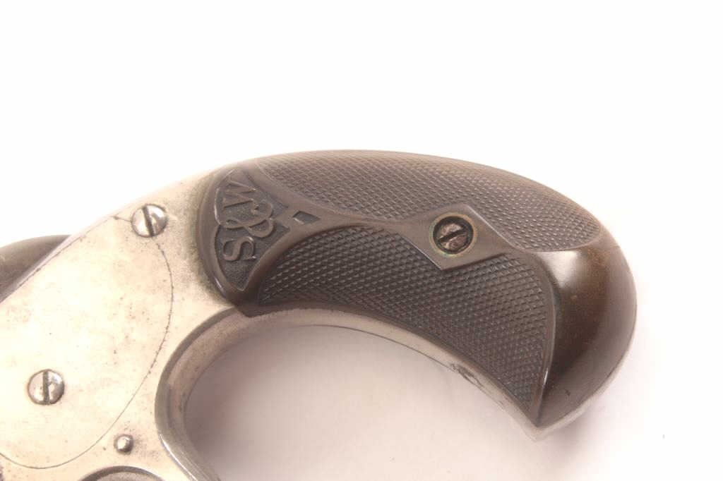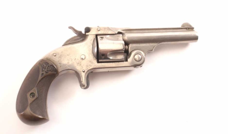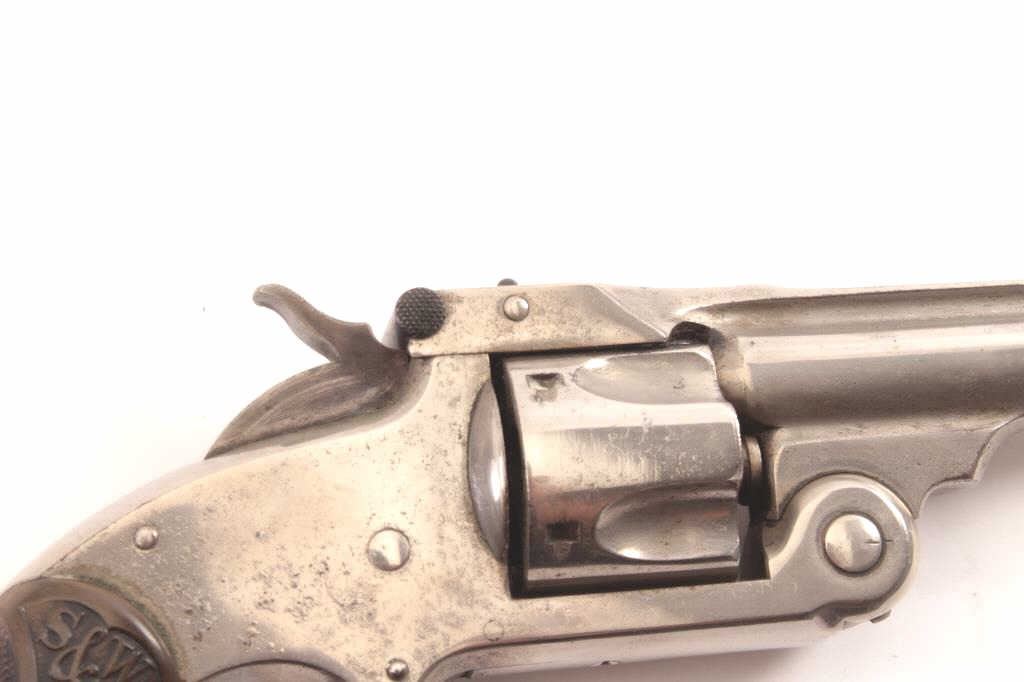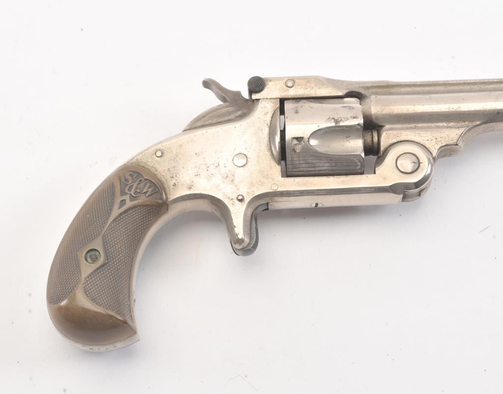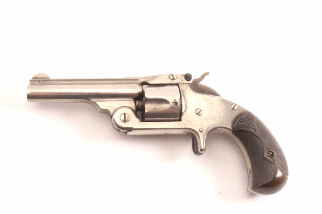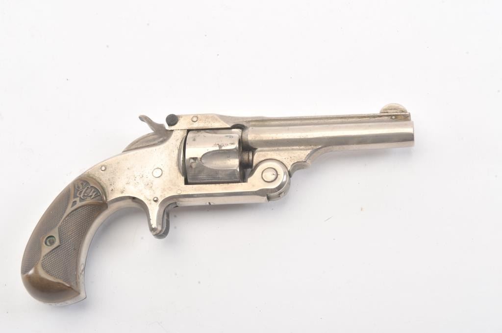 Smith & Wesson New Model .32 caliber single action revolver, S/N 25980 showing 85%-95% original nickel just beginning to “Bubble”. Good to very good markings and grips show edge wear from carry. Tight action and goodoverall. (Antique) Est.: $200-400