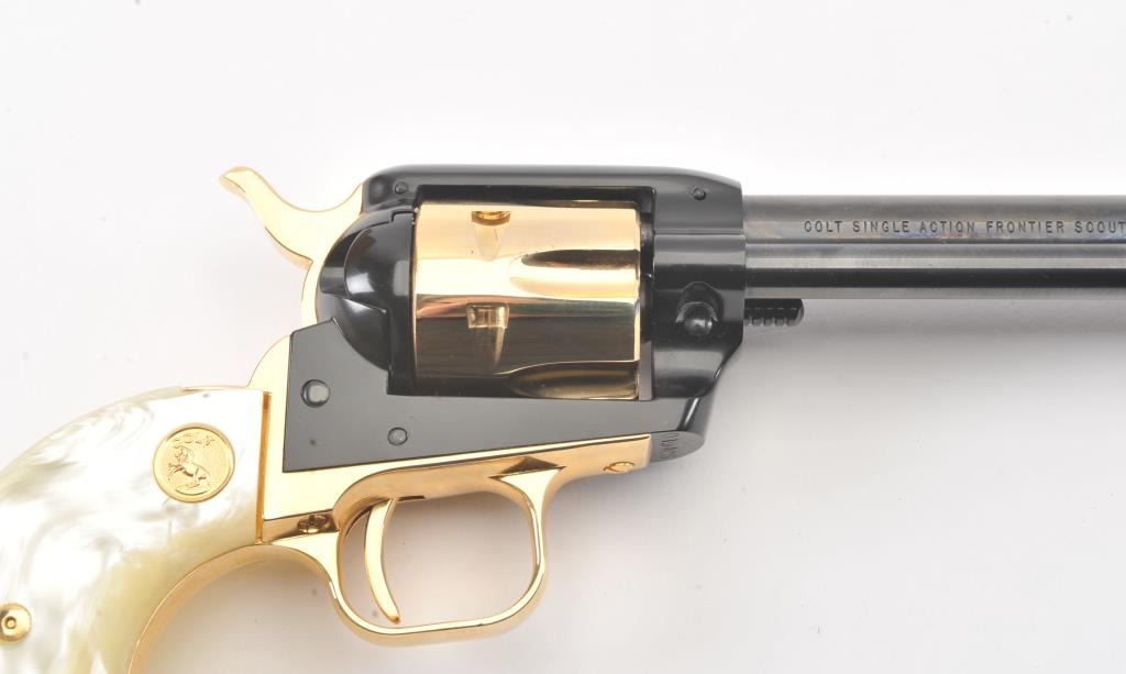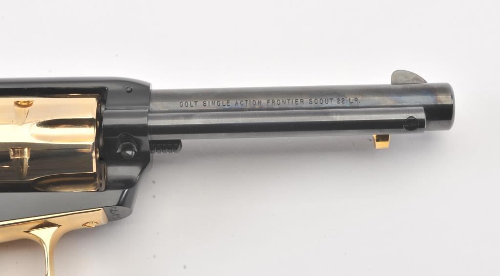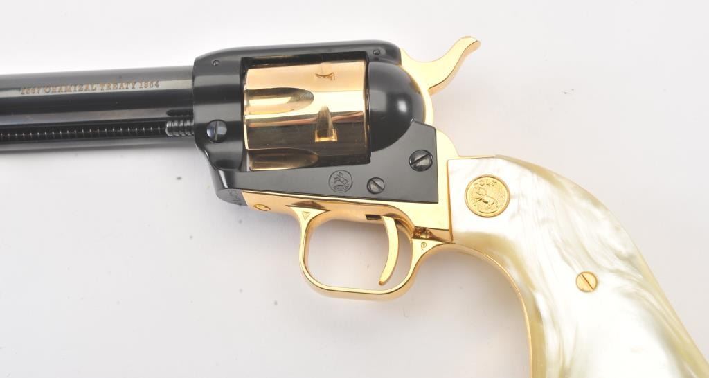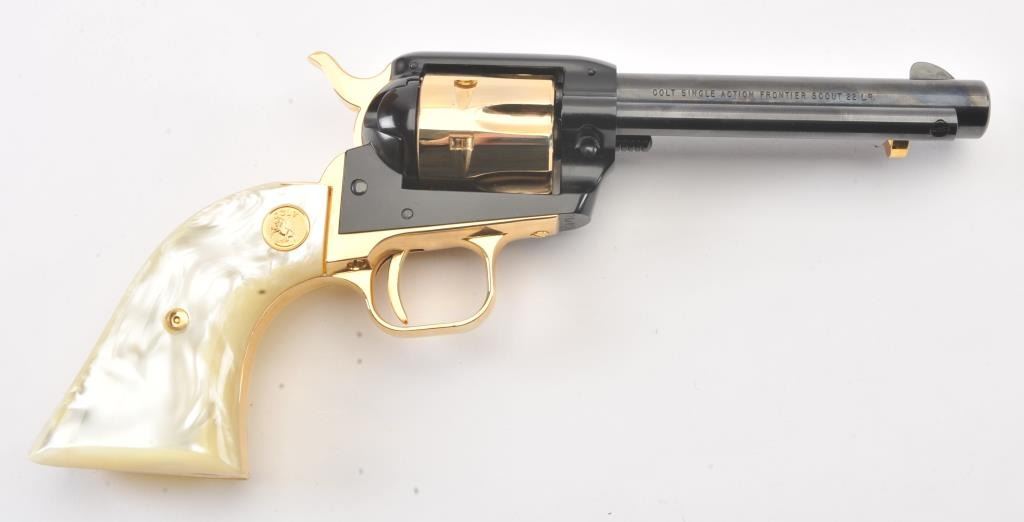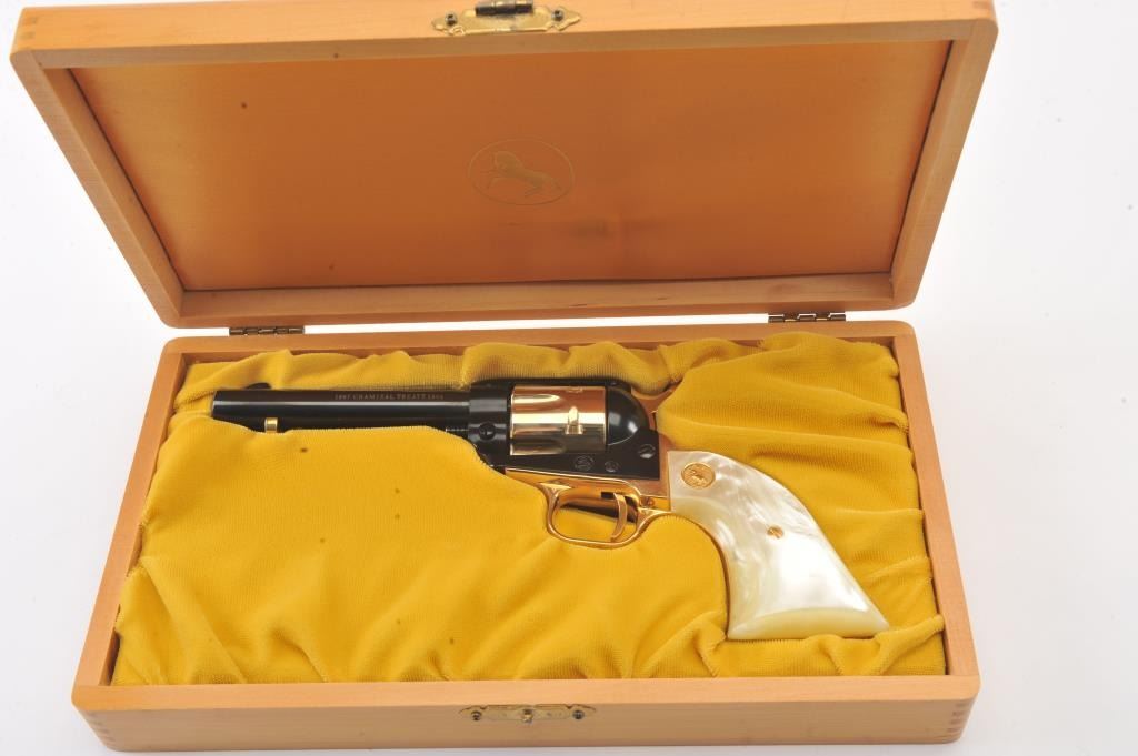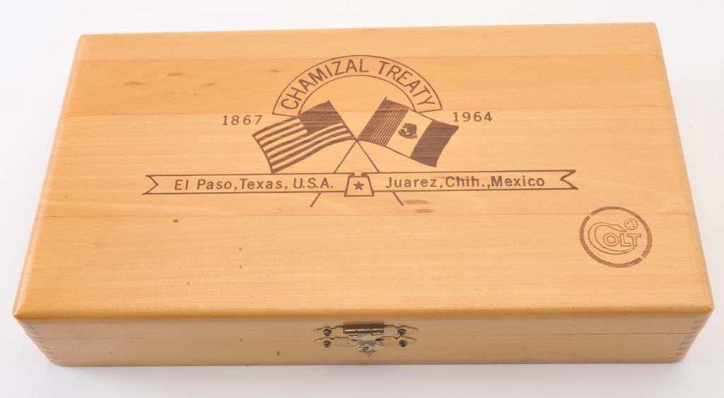 Colt Frontier Scout Chamizal Treaty Commemorative 1867-1964 single-action revolver, .22 Long Rifle caliber, Serial #2797GS. The pistol is as new in the wooden presentation box with a 4 ¾” barrel and goldmedallion faux pearl grips. The barrel and frame are blue in finish with the remainder done in gold plate. The factory wooden presentation box is lined in green velvet with an inscribed lid commemorating thetreaty between Texas and Mexico. Est.: $250-$500. (C+R/PPT).