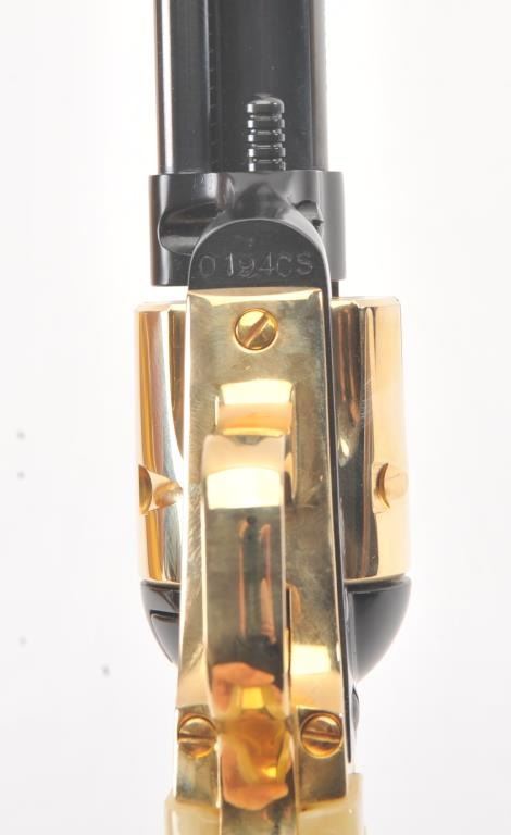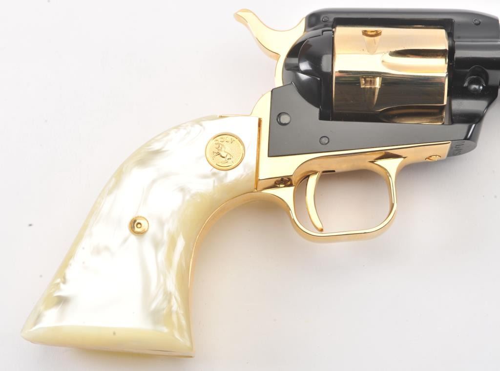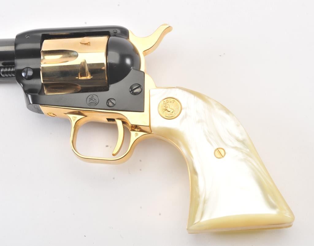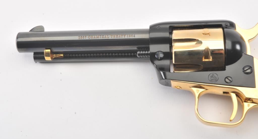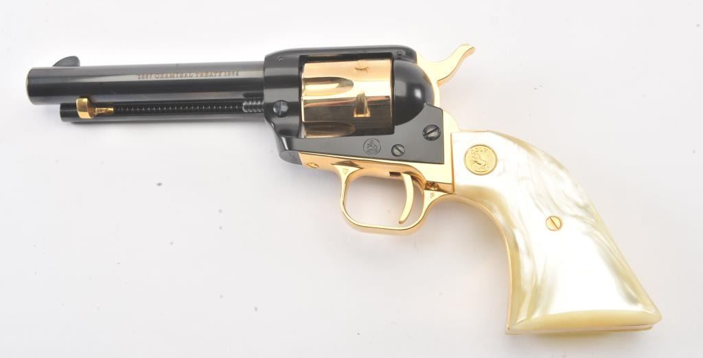 Colt Frontier Scout Chamizal Treaty Commemorative 1867-1964 single-action revolver, .22 Long Rifle caliber, Serial #2797GS. The pistol is as new in the wooden presentation box with a 4 ¾” barrel and goldmedallion faux pearl grips. The barrel and frame are blue in finish with the remainder done in gold plate. The factory wooden presentation box is lined in green velvet with an inscribed lid commemorating thetreaty between Texas and Mexico. Est.: $250-$500. (C+R/PPT).