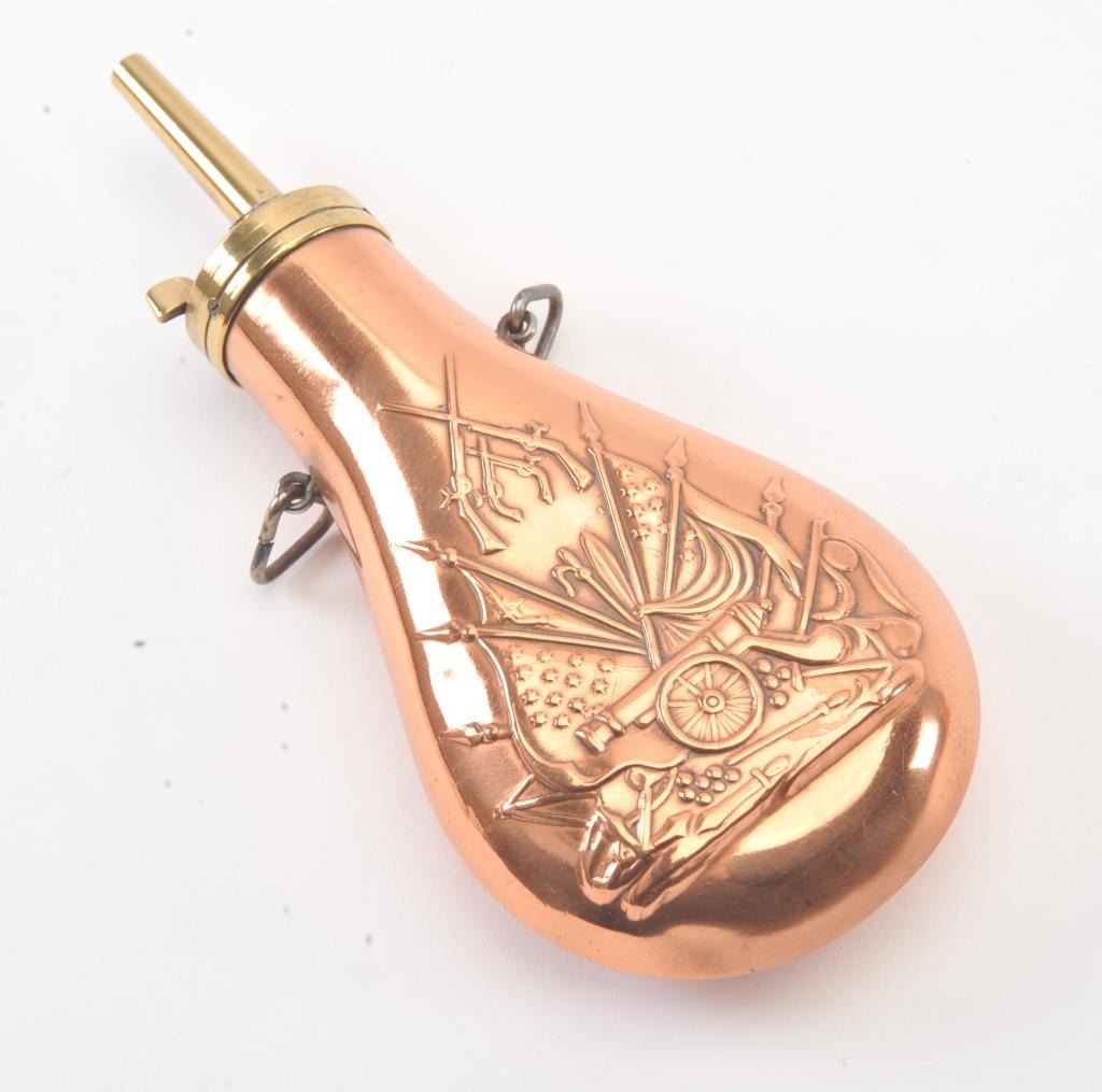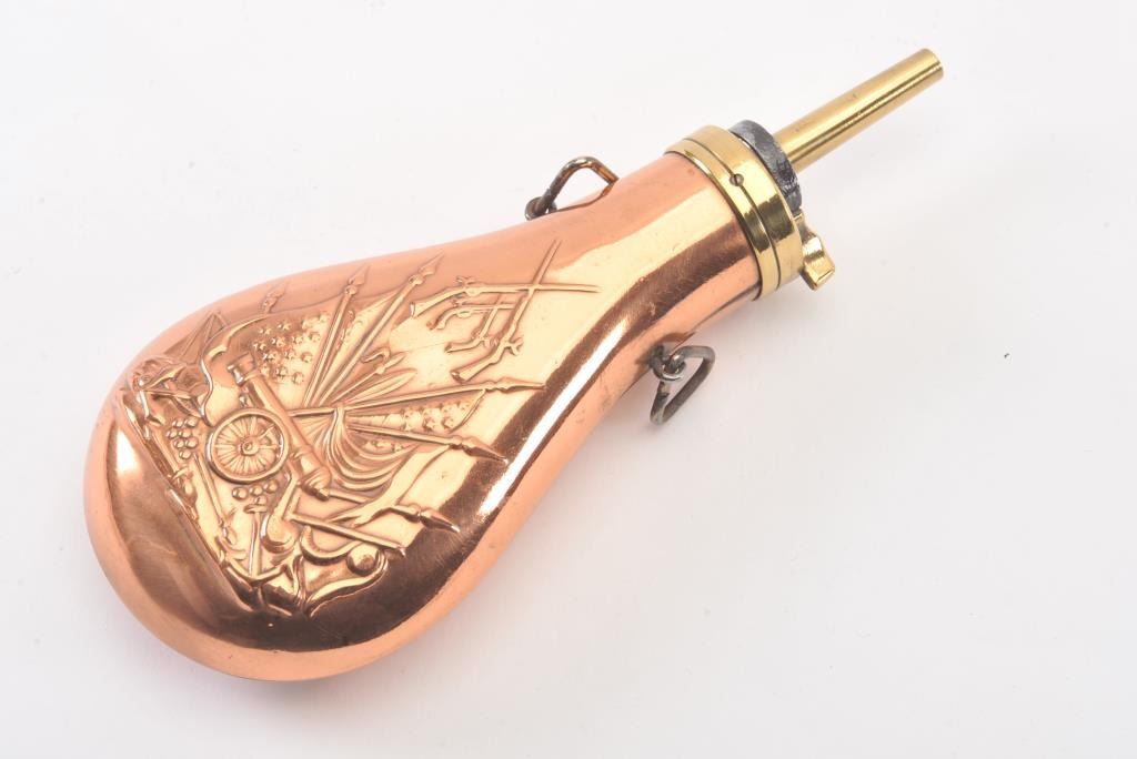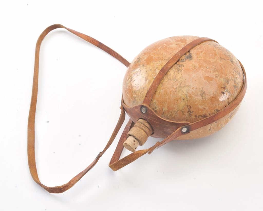 Reproduction gourd canteen with leather straps and brass powder flask. The canteen is a well-constructed reproduction with nice figure and finish. The top has a wooden spout and cork. The powder flask id brightcopper finish with brass spout in excellent condition. Est.: $50-$100.
