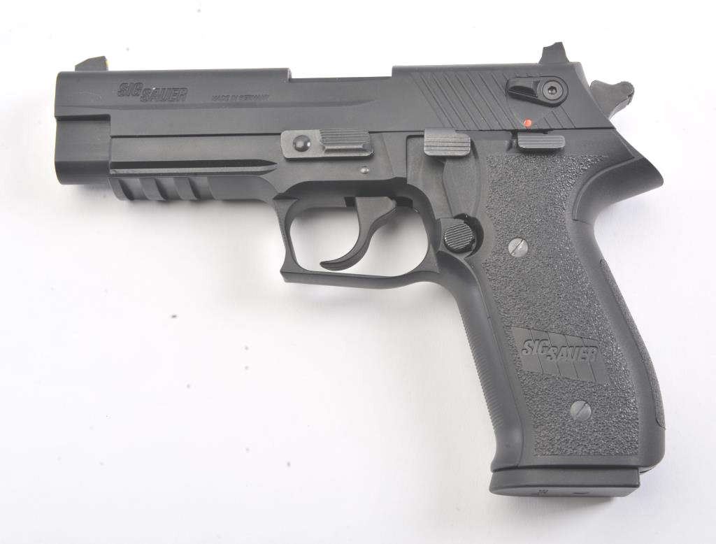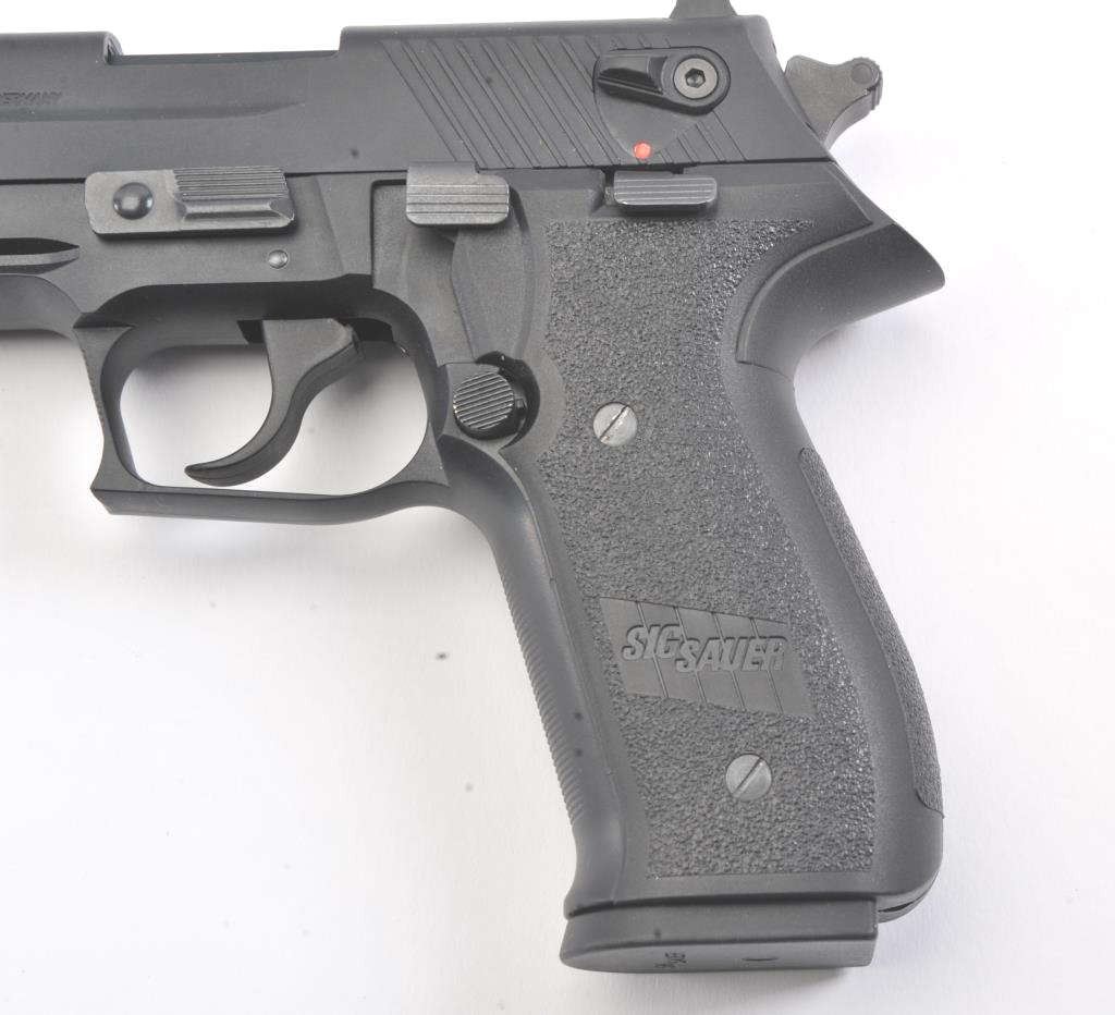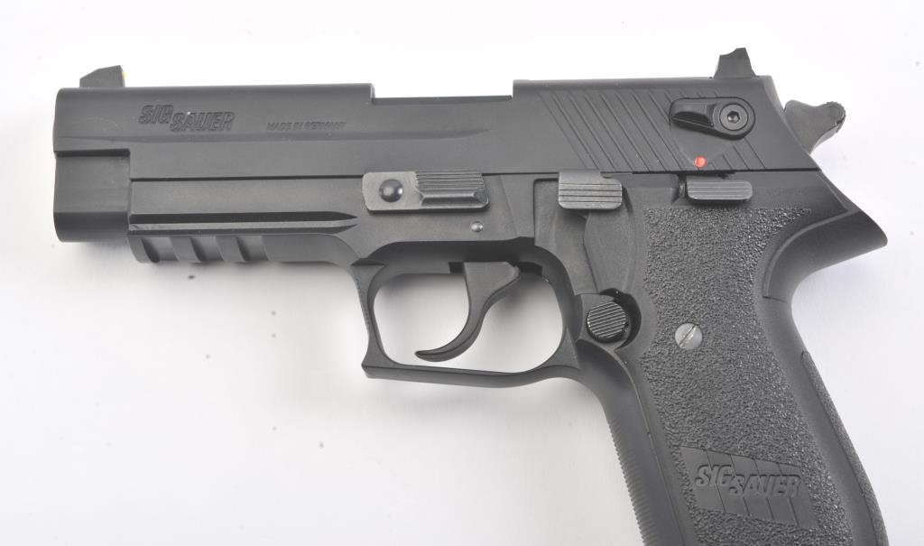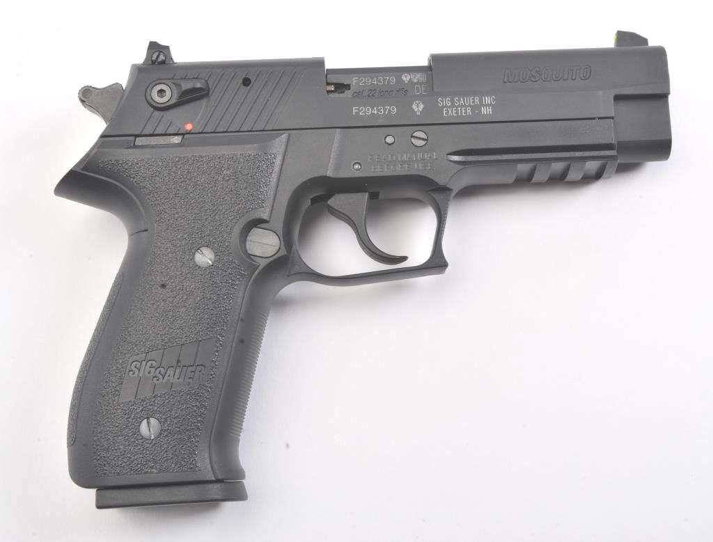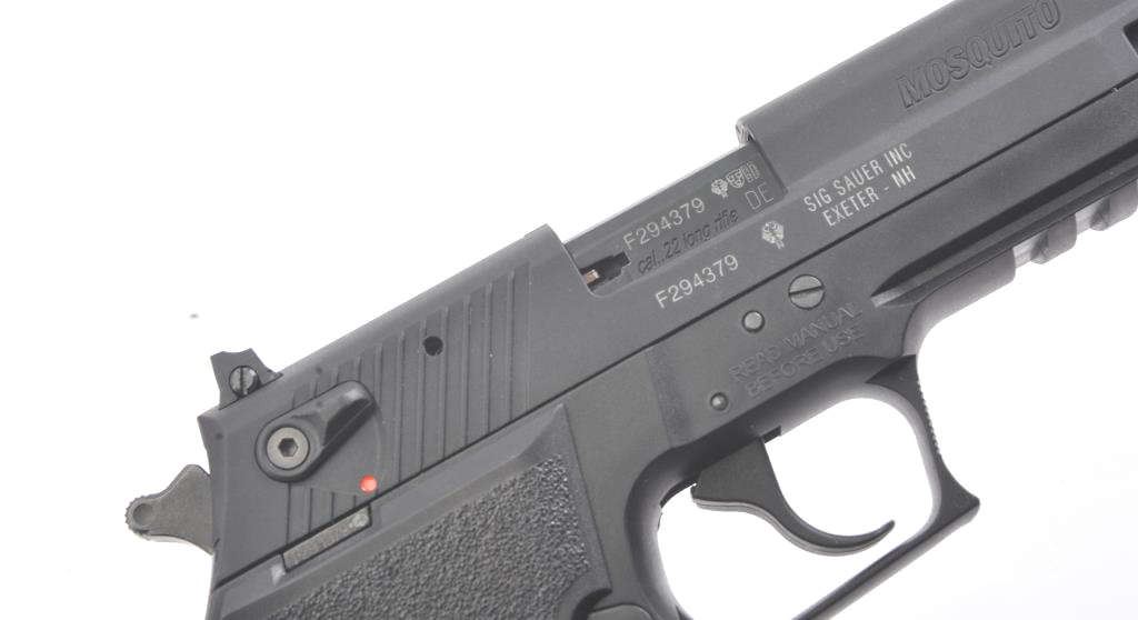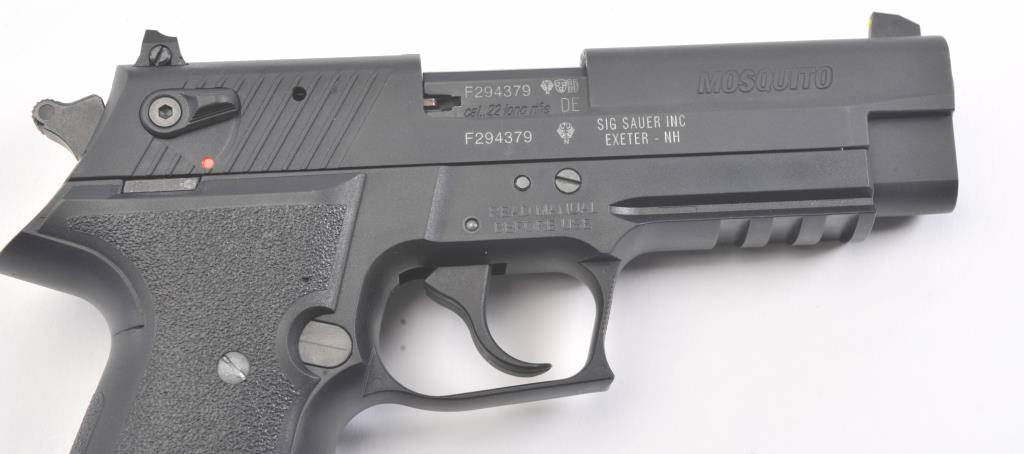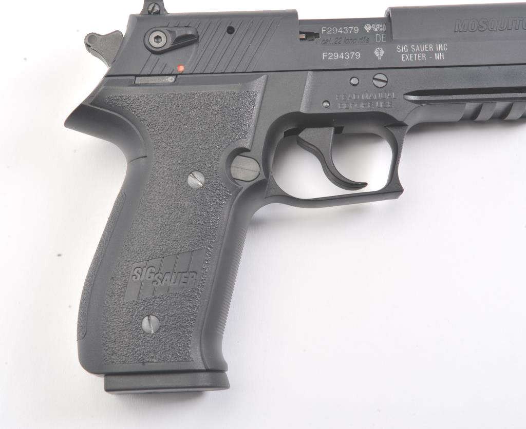 Sig-Sauer Mosquito Model 22B semi-automatic pistol, .22 caliber, Serial #F294379. The pistol is in excellent overall condition with a 4” barrel. The pistol retains nearly all the matte blue finish with only lighthandling marks and is marked, “MADE IN GERMANY”. The grips are excellent and show little to no use. The pistol comes in the factory plastic case with one correct magazine. Est.: $200-$400. (Modern/PPT).