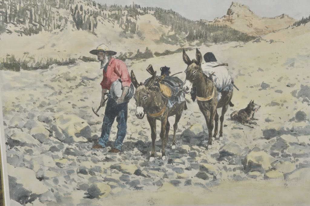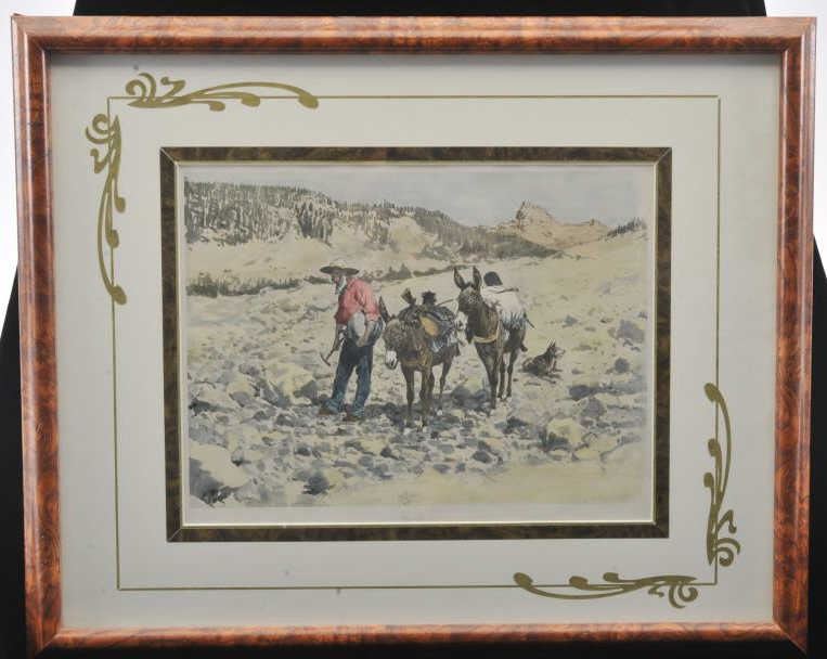Frederic Remington “The Gold Bug” print in relief half-tone printing. The original was completed in 1897 as part of a Remington portfolio called, “Drawings”. The piece is 13” x 10” and is Serial number 000110. Thepiece is nicely framed and matted with gold tone embellishment and a faux burl frame. Est.: $125-$250.