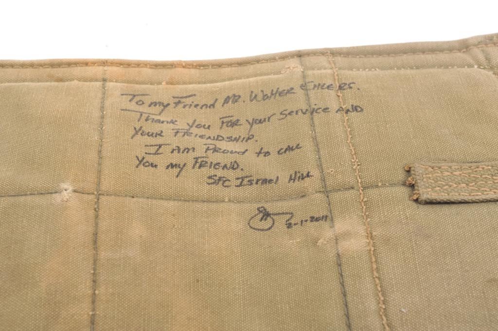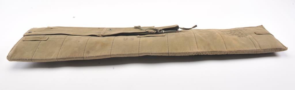 1903 Training rifle with sling marked "Dummy Training Rifle Mk I - U.S.N. Parris-Dunn Corp Clarinda Iowa" on the butt, with canvas case. Case is personalized "To my friend Mr Walter Ehlers. Thank you for your serviceand your friendship. I am proud to call you my friend. SFC Israel Hill (with signature) 2-1-2011. Ehlers was a Congressional Medal of Honor winner with a letter of provenance from the estate seller of his home andeffects. The rifle is in good condition with a canvas sling, functioning bolt, blued finish, sights, and metal butt plate. The US issue M-1950 Parachutists canvas drop bag is in very good condition overall, with a small 1" tear in the top flap. Est. $250-500