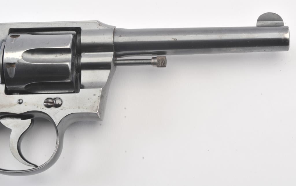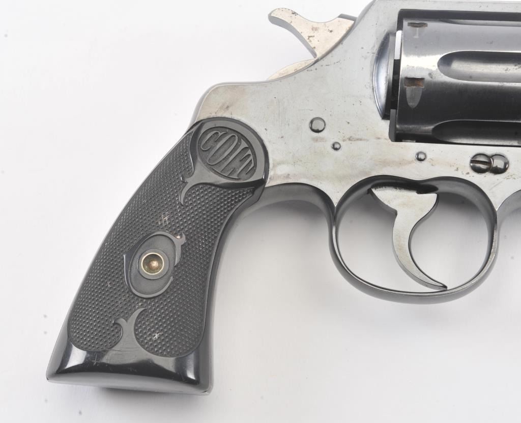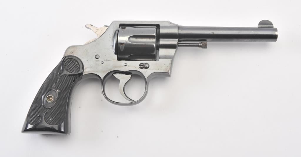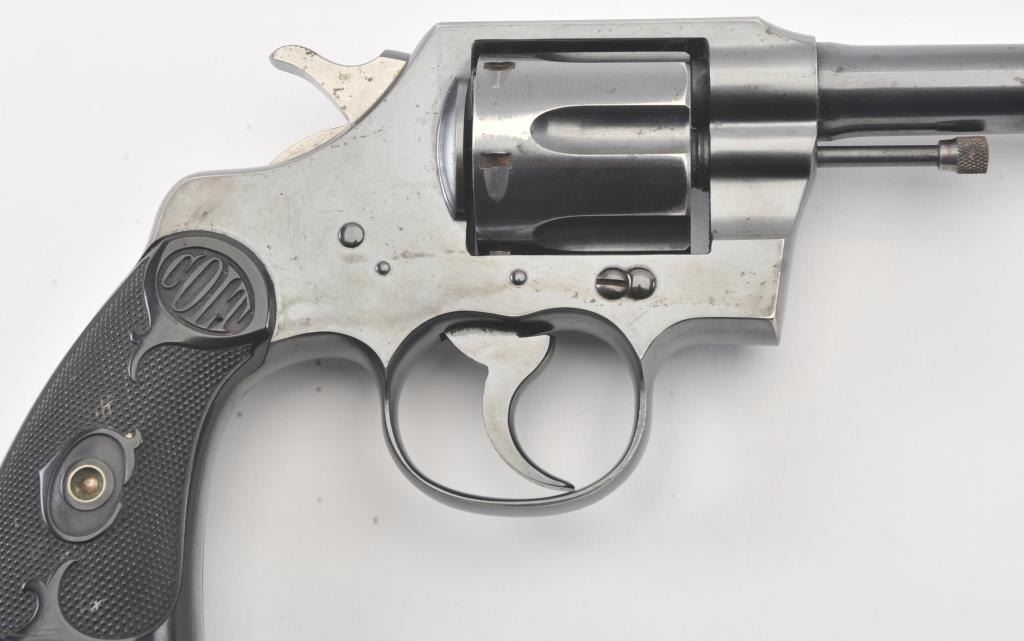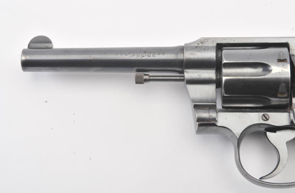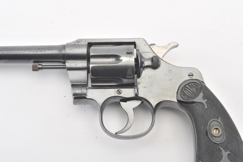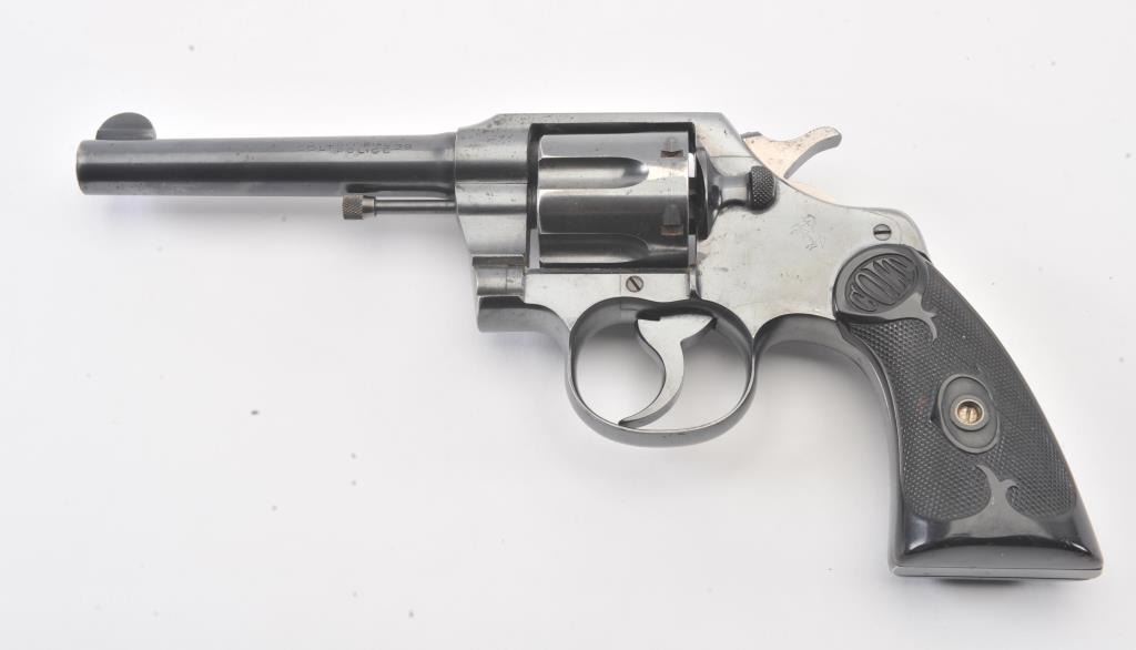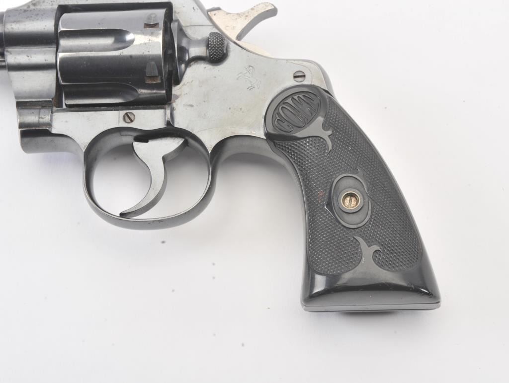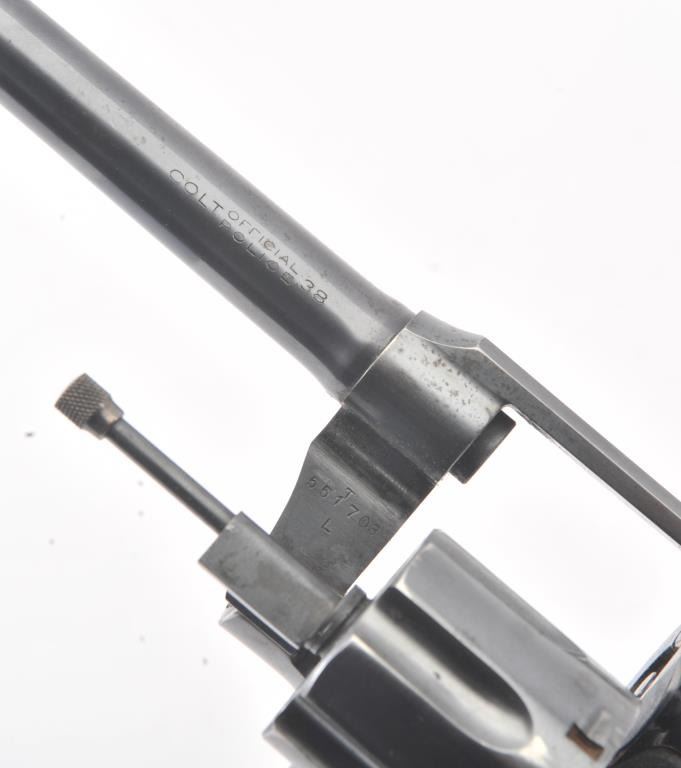 Colt Official Police DA revolver, .38 caliber, 5” barrel, blued finish, checkered black hard rubber grips, S/N 551703; overall fine condition showing approximately 98% original finish, fine bore, crisp action,sharp markings and fine grips. (C&R/PPT). Est.: $400-$800.