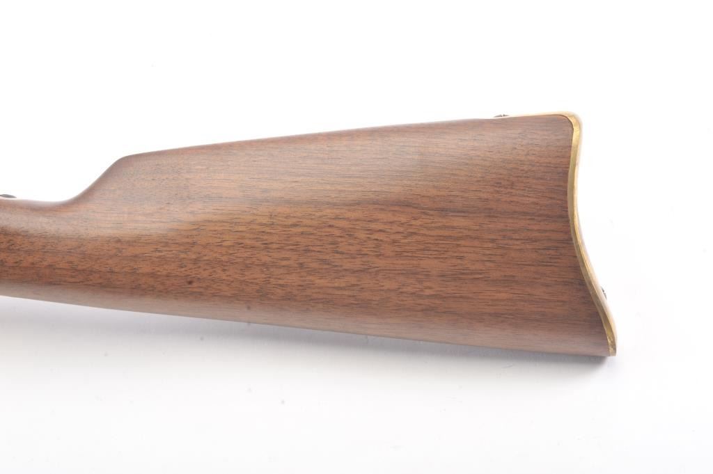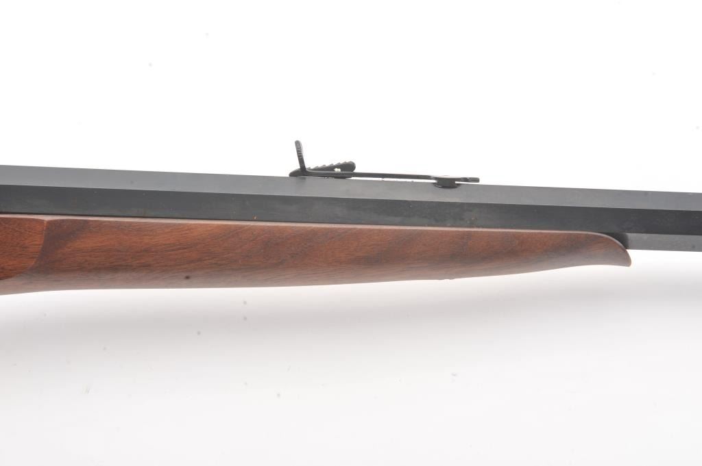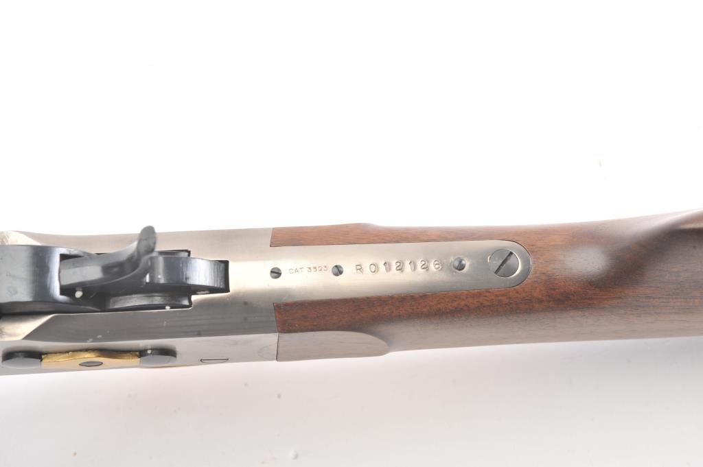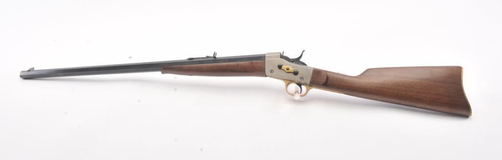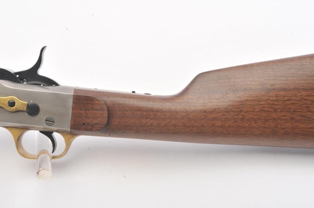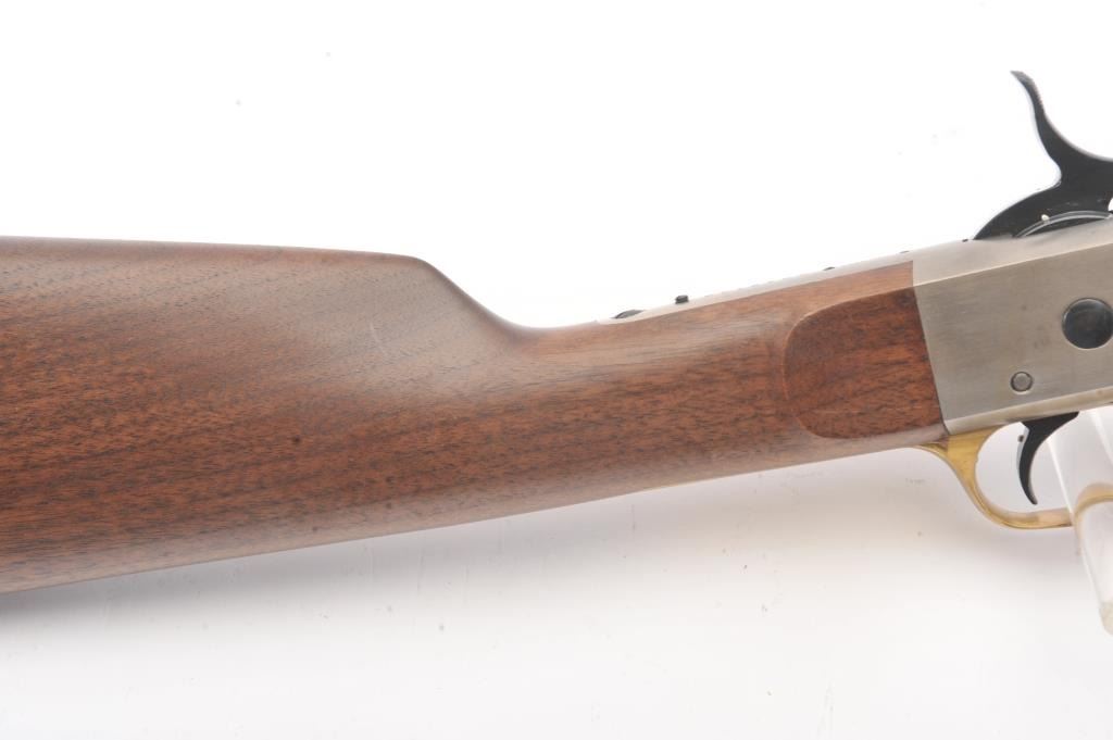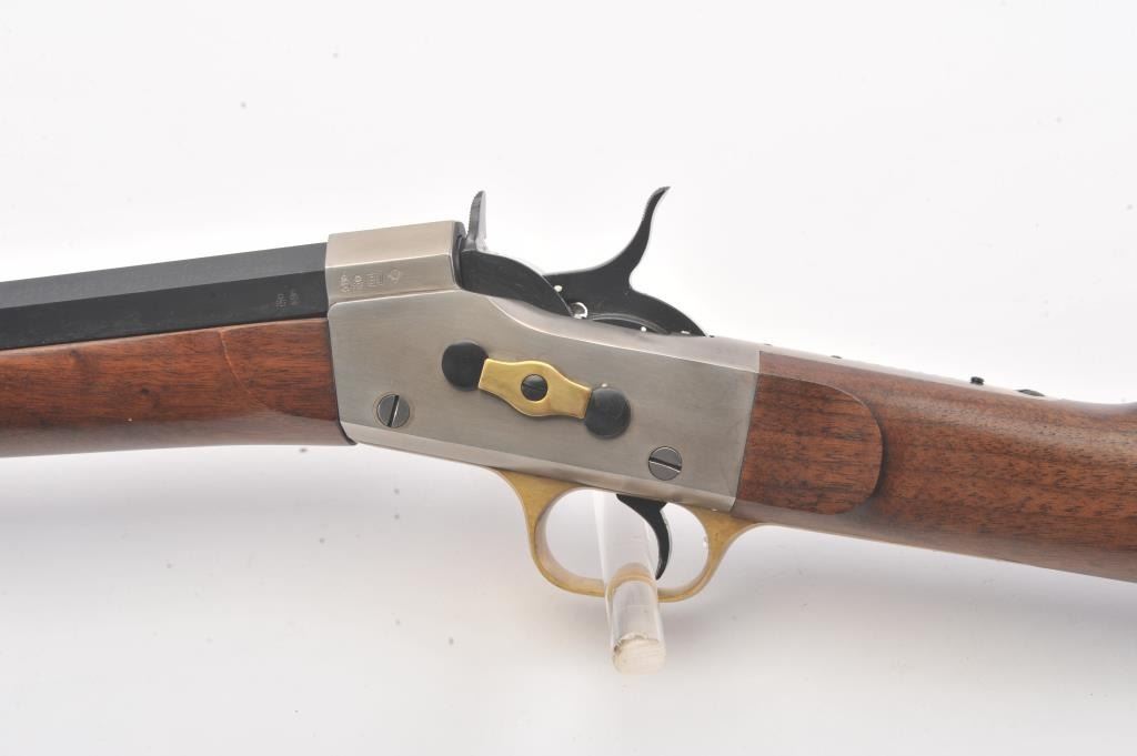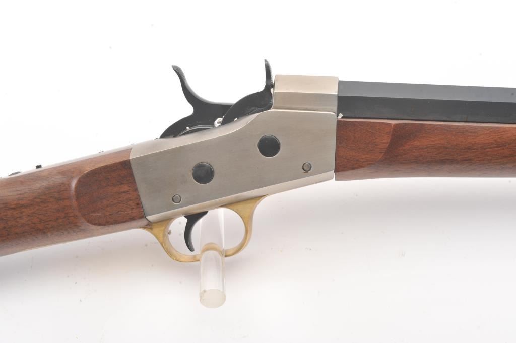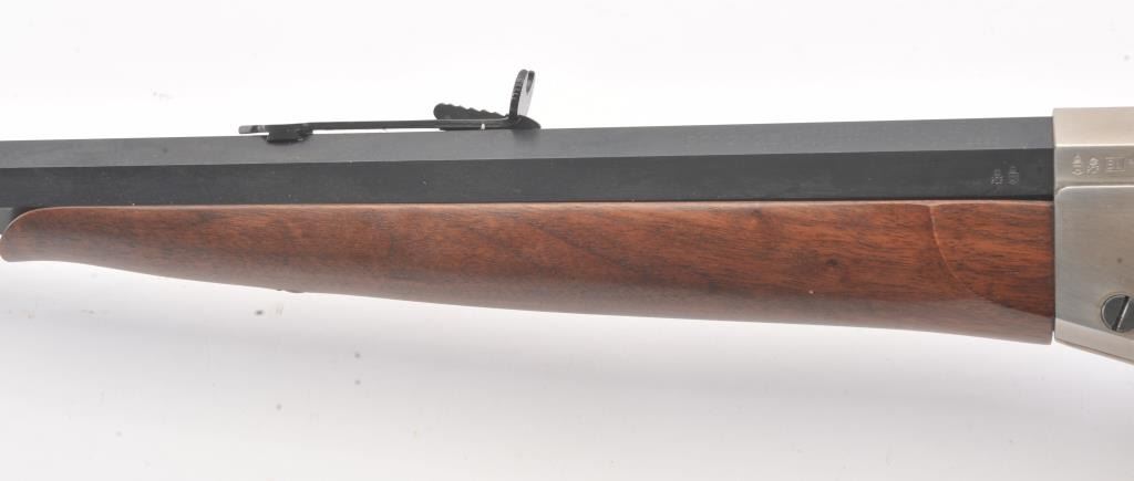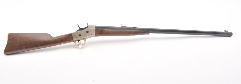 EMF Rolling Block single shot Target Model, .357 Magnum caliber, Serial #R012126. The rifle is as new in the factory cardboard box with a 30” octagon barrel. The receiver is beautifully coin finished in the white whilethe trigger guard and butt plate are finished in brass. The rifle comes in the factory cardboard box with all associated packaging materials. Est.: $1,000-$2,000. (Modern).