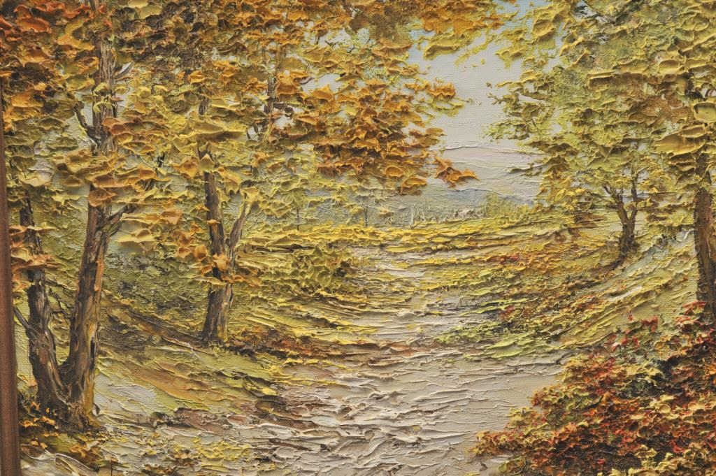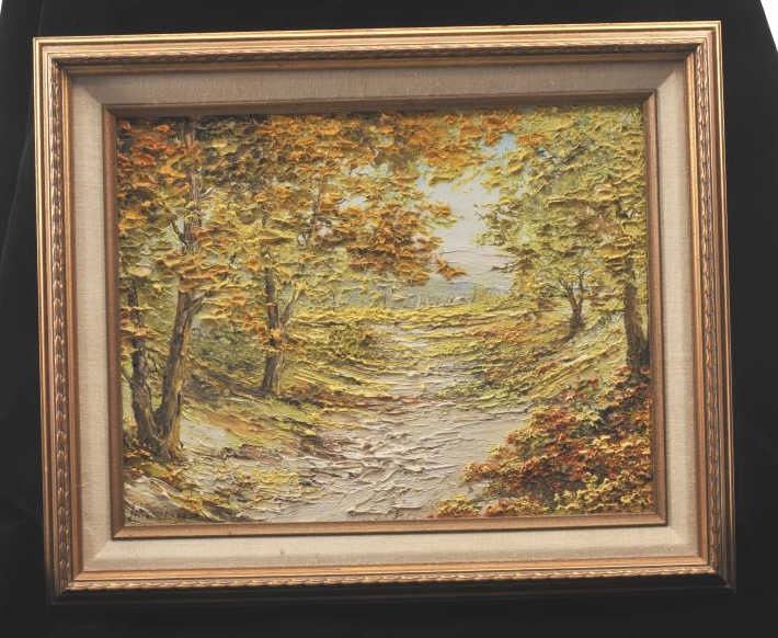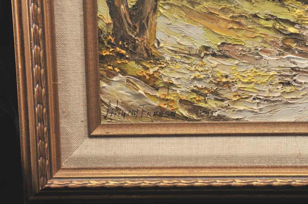 Original framed oil on canvas painting by Liliana Frasca. The piece is 10 ½” x 13 ½” nicely framed, titled “Creek in Autumn”. This well accomplished impressionist work shows beautiful color and movement. Paintedin the impasto style, the piece seems to reach from the canvas. Ms. Frasca was born in Buenos Aires, Argentina in 1932 and is still producing art. Est.: $300-$600.