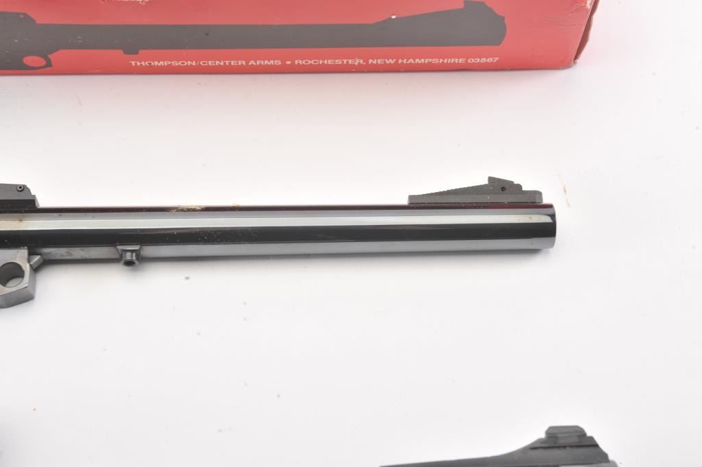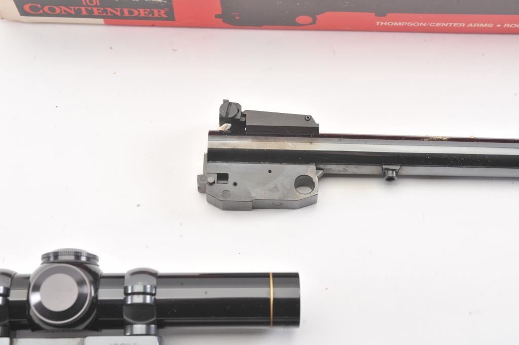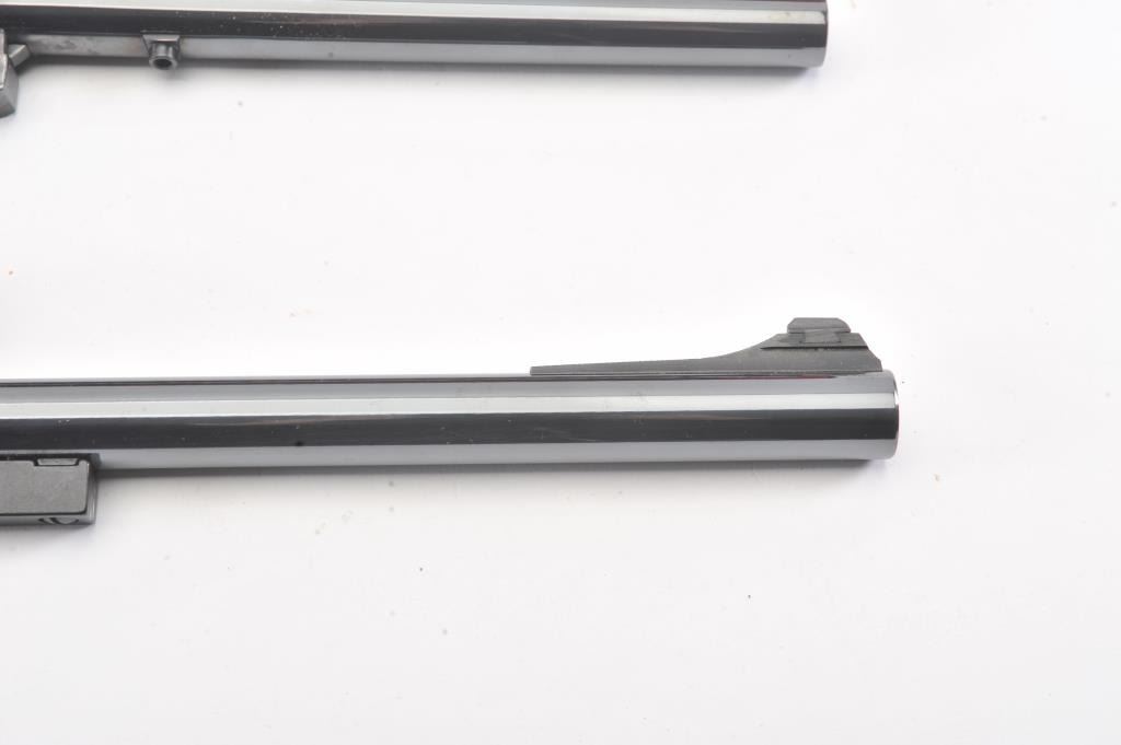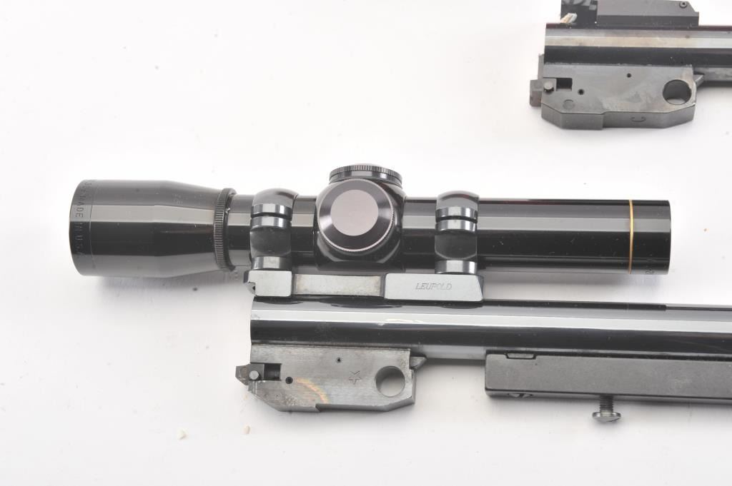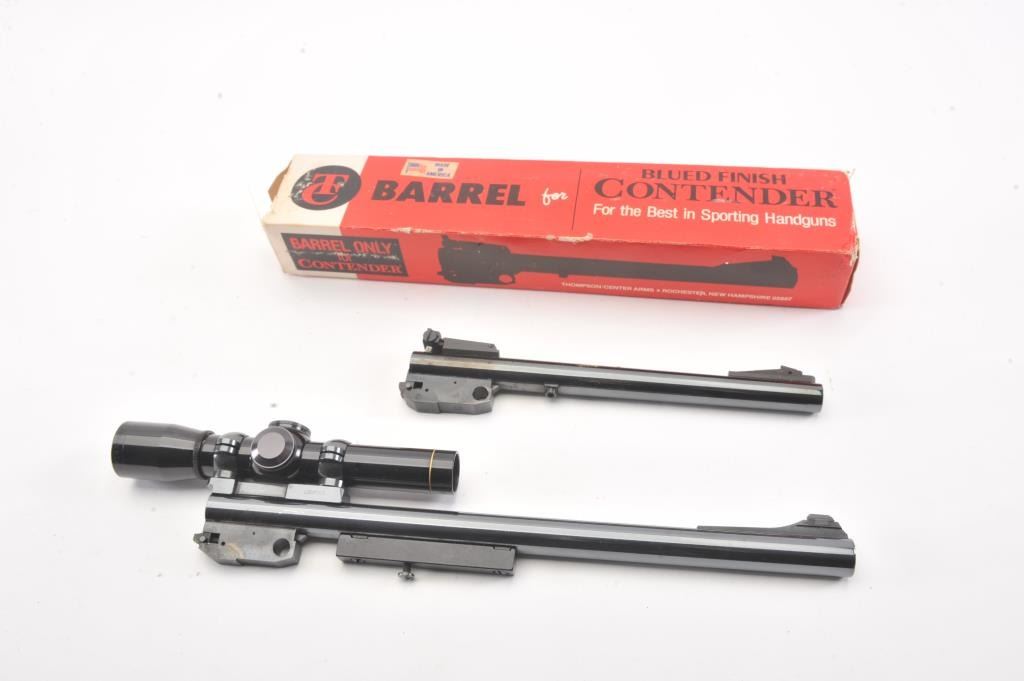 Lot of 2 Thompson Contender barrels; .223 Rem. 14" with Leupold M8-2x scope and .22 Hornet 10", fine condition, in boxes. Est. $300-600
