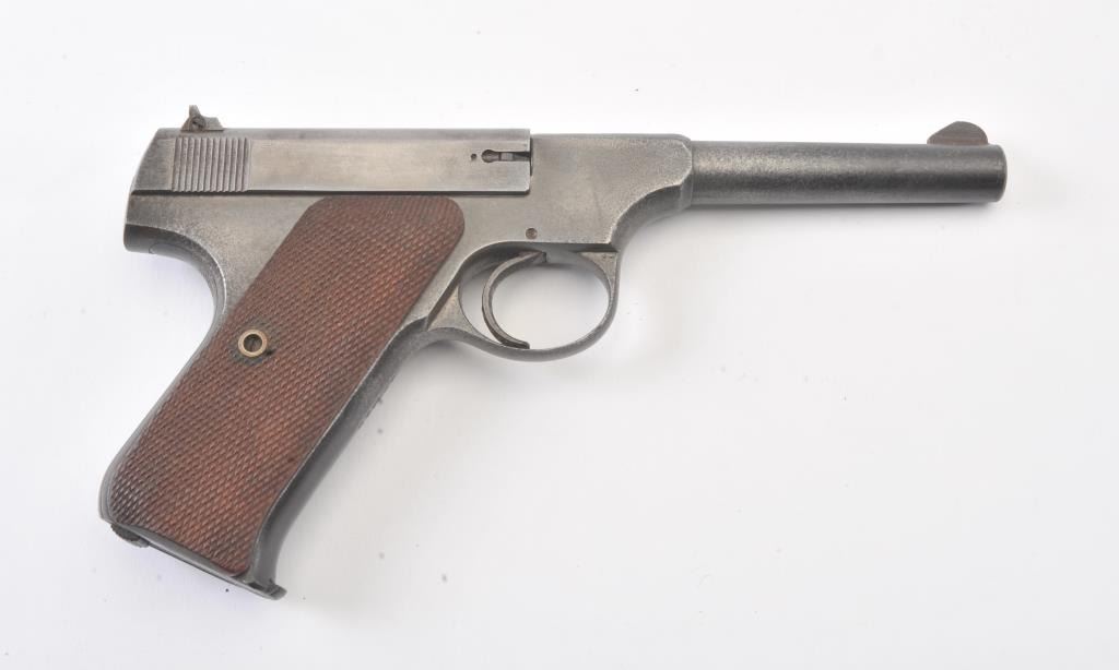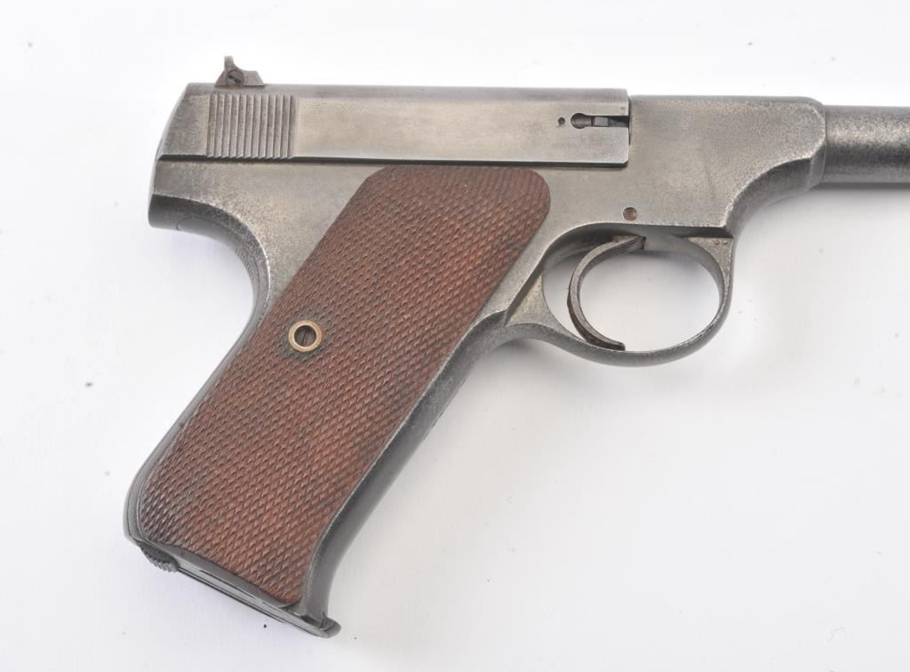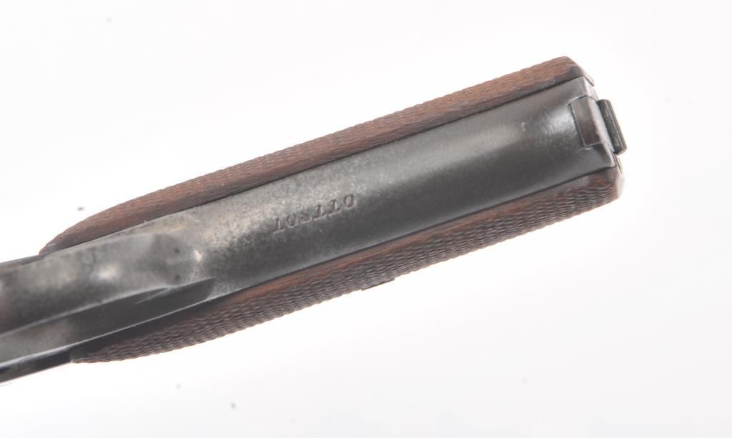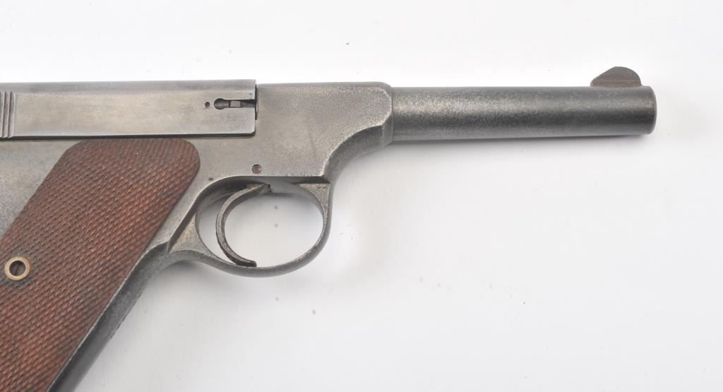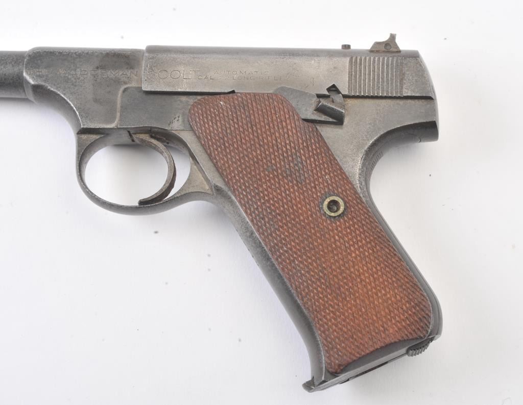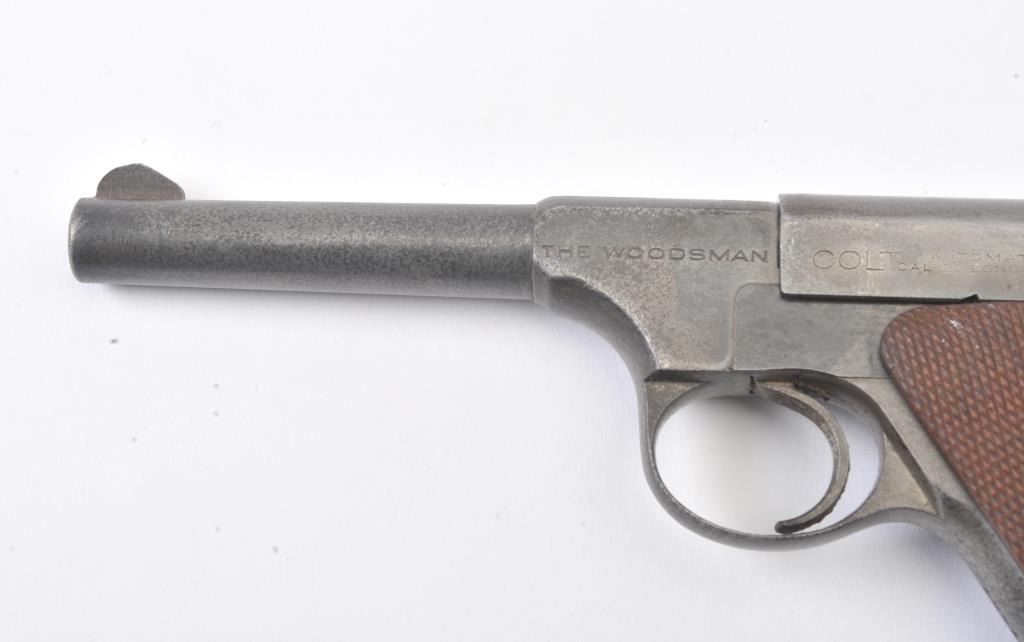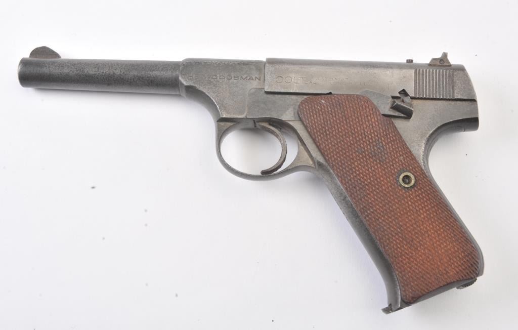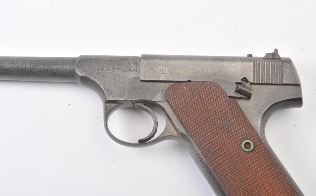Early 1st Model Colt Woodsman semi-automatic pistol, .22 LR caliber, Serial #108110. The pistol is in good overall condition with a 4 ½” barrel. The pistol has suffered light to moderate surface erosion due to poor storage, primarily on the barrel. The checkered wood grips are in good condition with sharp checkering. The bore is fair, the action functions and the markings are legible. The lot includes one correct magazine and a 17” x 12” pistol case988. Est.: $300-$600.