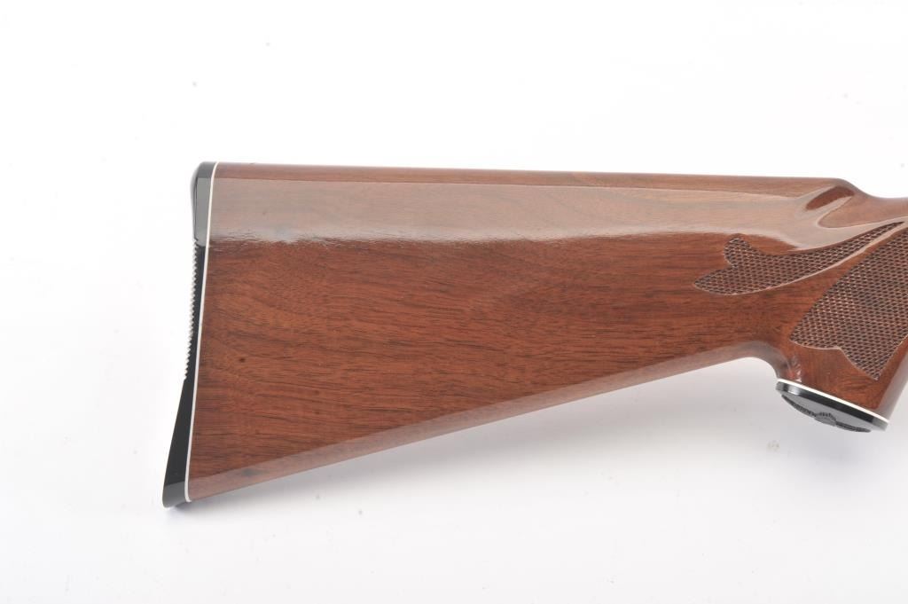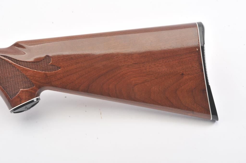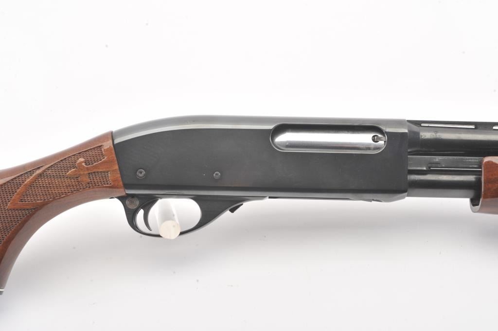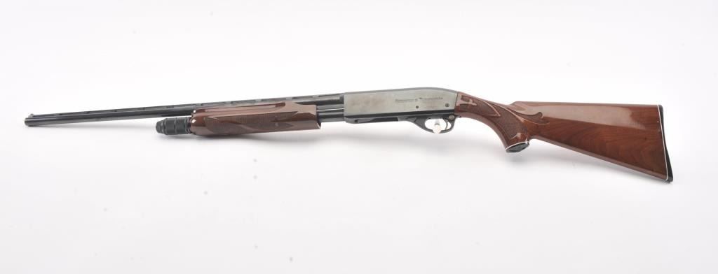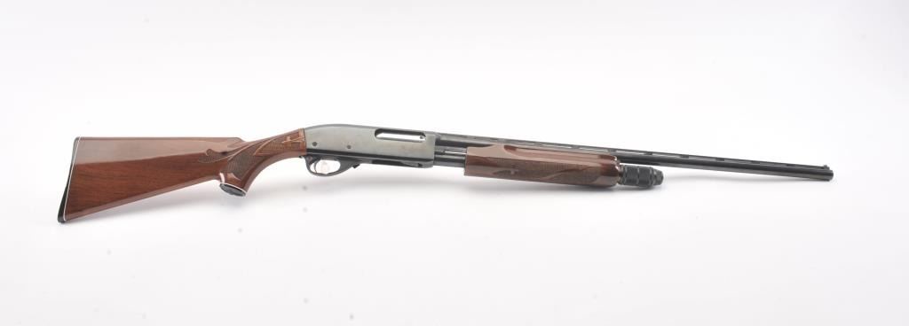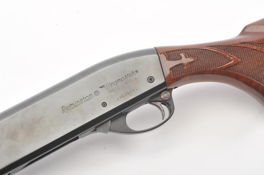 Remington Model 870 LW pump shotgun, 28 gauge, Serial #V369543J. The shotgun is in excellent overall condition with a 25” barrel with a full-length ventilated rib and an ivory bead front sight. The finely checkered Walnut stock is in very good condition with light handling marks. The butt stock ends with a plastic Remington marked butt plate providing a 14” LOP. The bore is good, the action is crisp and the markings are sharp.Est.: $350-$700. (Modern).