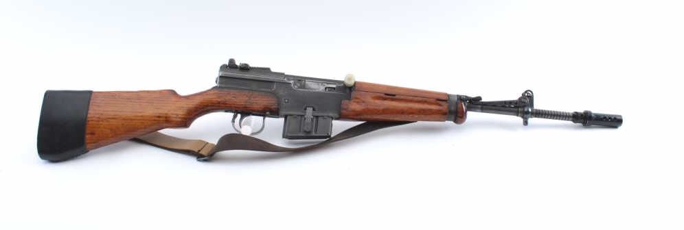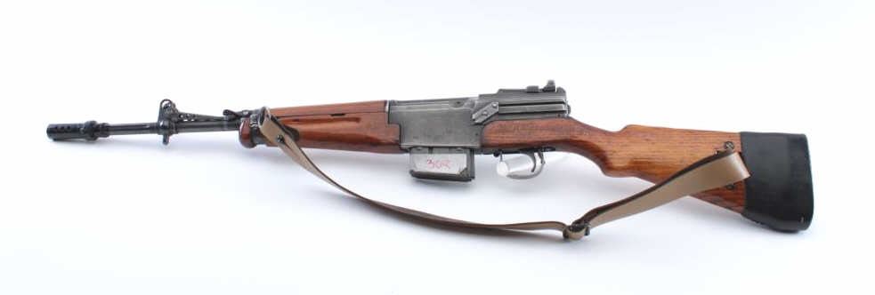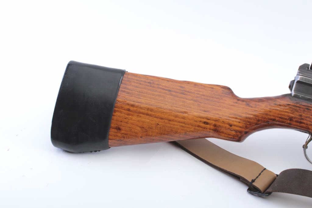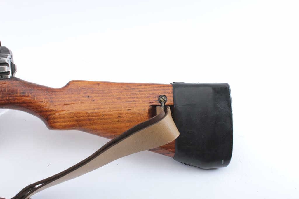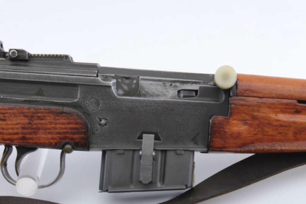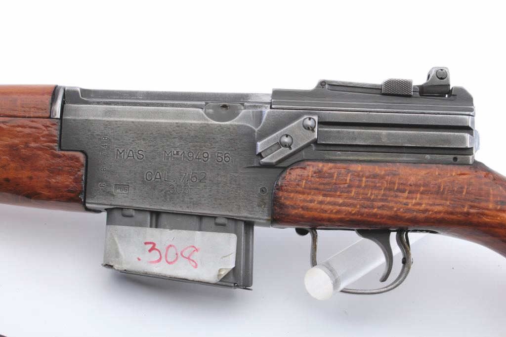 French MAS Model 1949/56 semi-automatic rifle, .308 caliber, Serial #G67748. The rifle is in very good overall condition with a 21” barrel with the proprietary muzzle break. The metal surfaces retain asignificant amount of military finish with black painted applied to the muzzle break. The rifle is marked, “MADE IN FRANCE” and import marked on the left side of the receiver. The smooth wood stock is in goodcondition with sling swivels and a period leather sling added. The bore is good, the action is crisp and the markings are sharp on this French battle rifle re-chambered to .308. Est.: $400-$800. (C+R).