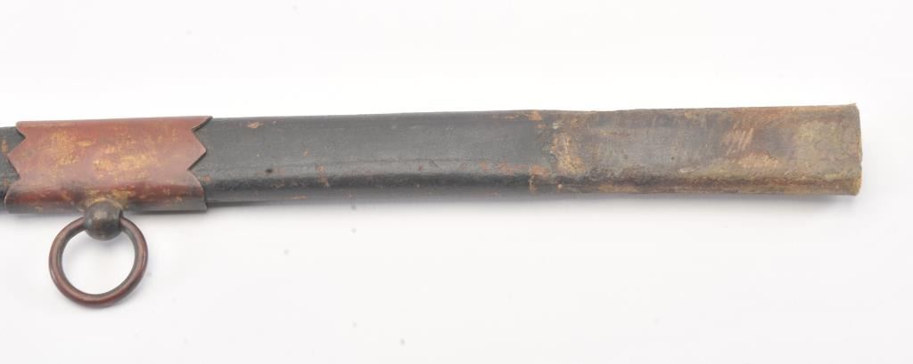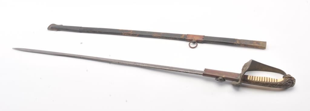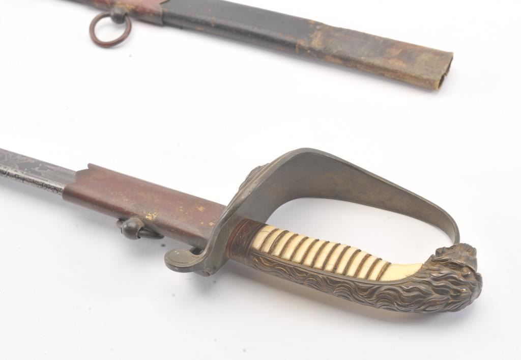 Imperial German Naval Sword Pattern 1876 Saber circa early 1900s to WWI with “WK & C” Maker’s mark. Gilt bronze basket hilt has full lion head with long mane. Very little gilding remains. 12 rib ivory grip shows some age cracking and contains a single wisted wire wrapping. Ferrule band has leaf design. Rounded rectangle style bow with raised line décor, contains an oval with crown over fouled anchor. Folding guard is engraved with “Schneider” and contains a hole for locking scabbard. Full pipe back measuring 5/8” wide slightly curved 29 ¾” blade that is triple acid etched with panoply of arms and crown over fouled anchor. The blade has becomeblackened and some of the acid etching is worn. The stitched leather scabbard shows wear and has three plain brass mounts with two suspension rings. Measures 36” overall. Est.: $400-$800