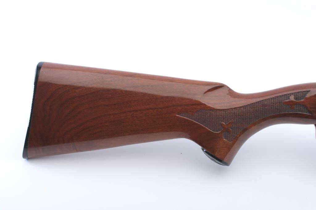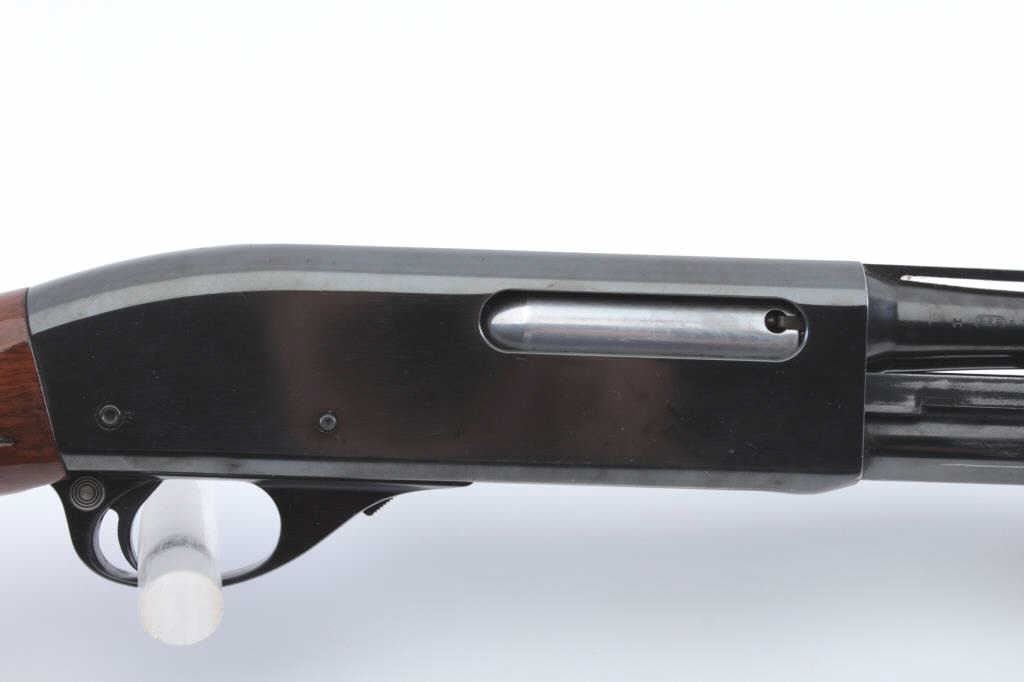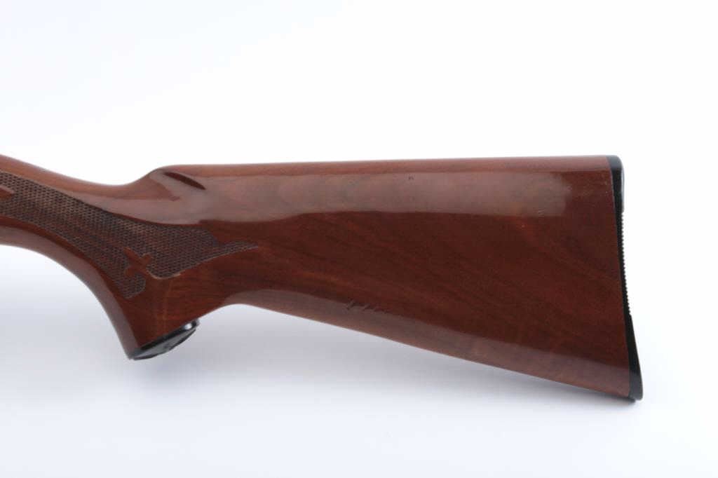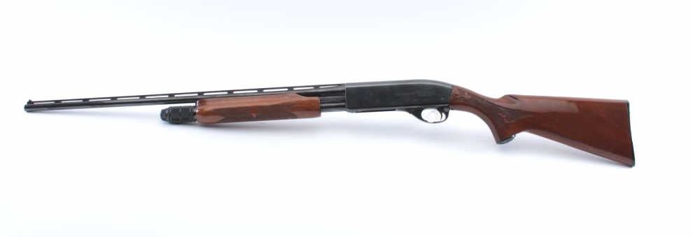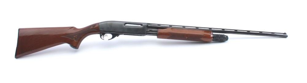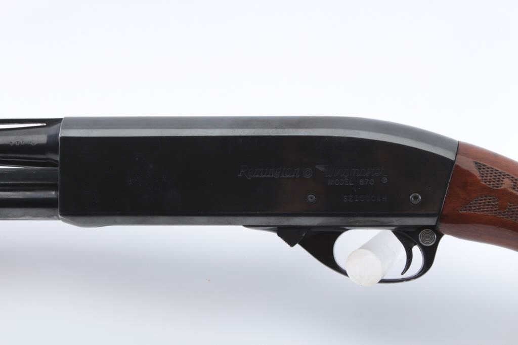 Remington Model 870 Wing Master pump shotgun, .410 gauge, Serial #S210004H. The shotgun is in fine overall condition with a 25” Skeet choked barrel with a full-length ventilated rib. The barrel and receiver retain nearlyall of the blue finish with light handling marks. The checkered wood stock is in very good condition with small mars consistent with field use. The butt stock ends with a checkered plastic butt plate providing a 14”LOP. The bore is good, the action is crisp and the markings are sharp. The lot includes an addition 25” barrel in Full choke with a full-length ventilated rib. Est.: $400-$800. (Modern).