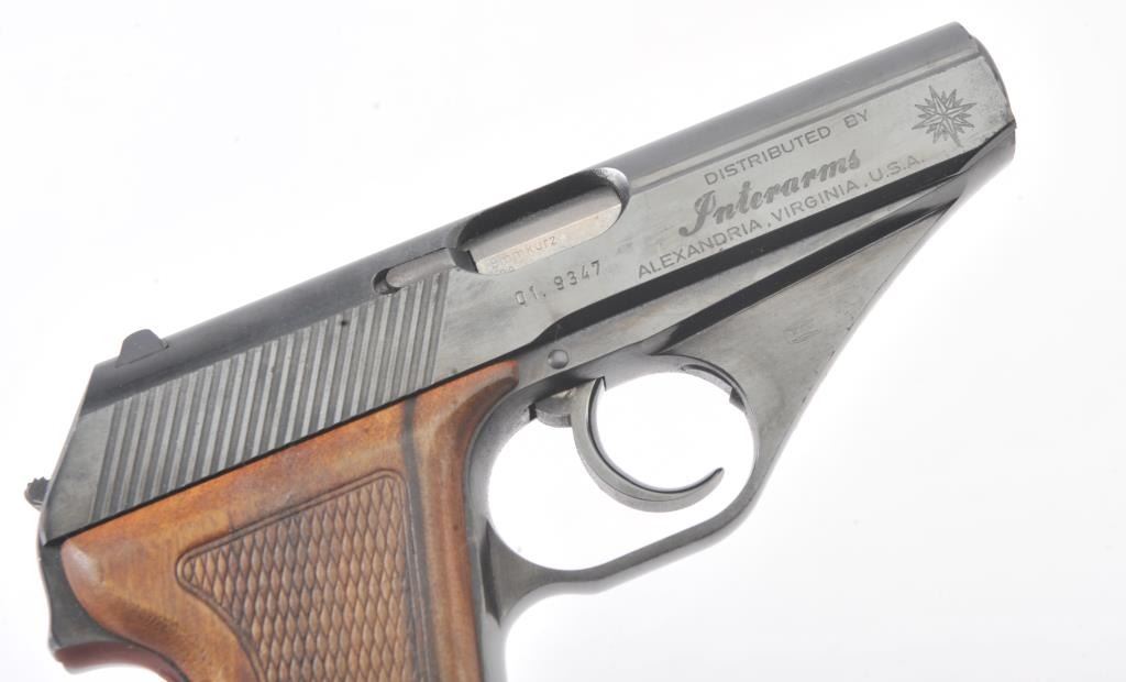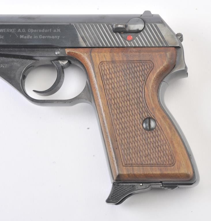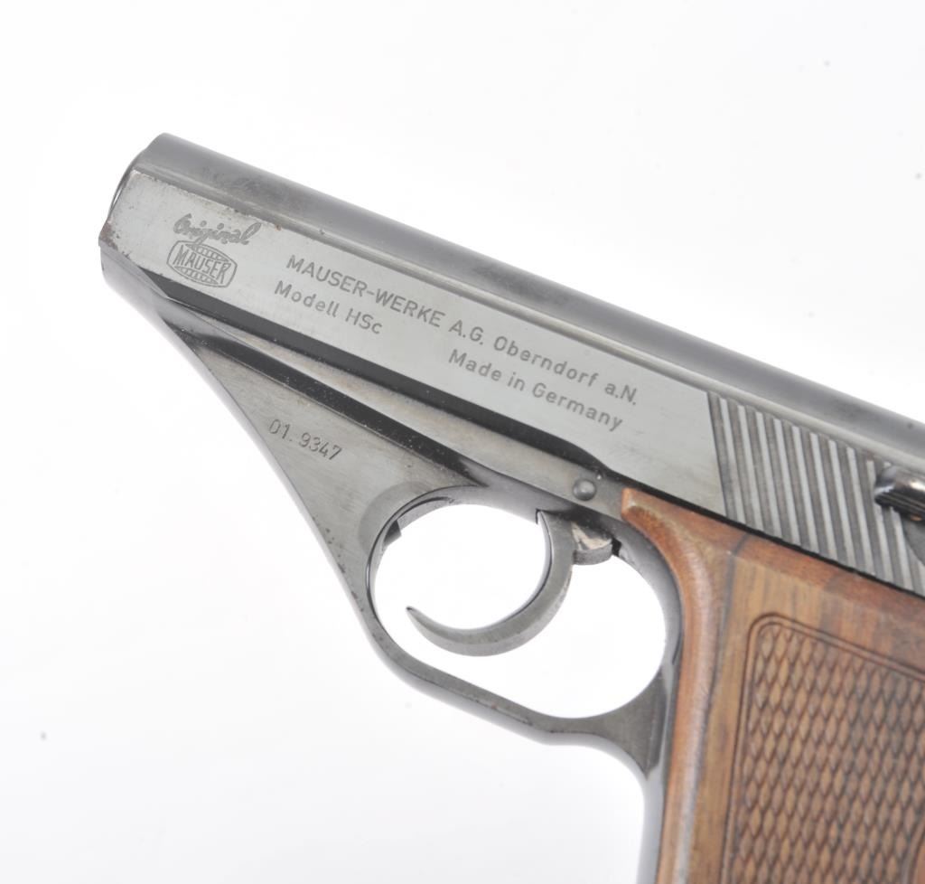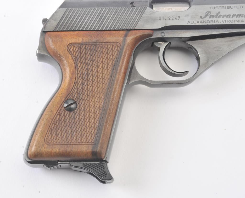 Mauser HSc semi-automatic pistol, .380 caliber, Serial #019347. The pistol is in fine overall condition with a 3 ¼” barrel. The pistol retains nearly all of the blue finish with light holster wear at the muzzle. The slide is import marked, “Interarms” and the Mauser banner is visible on the trigger guard. The checkered wood grips are in very good condition. The bore is good, the action is crisp and the markings are sharp. Thelot includes one correct, Mauser marked magazine. Est.: $350-$700. (Modern/PPT).